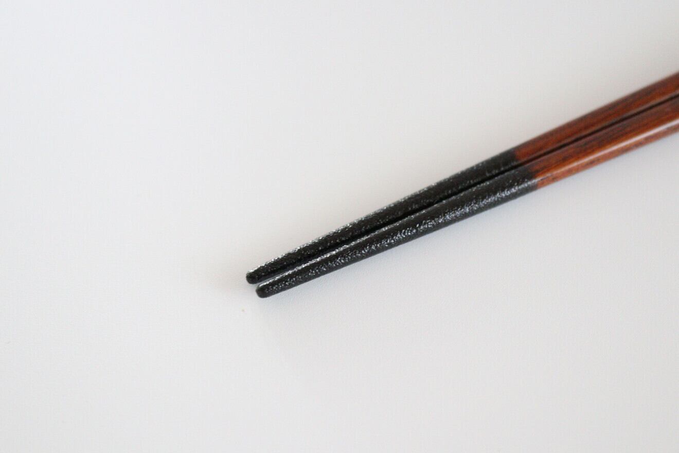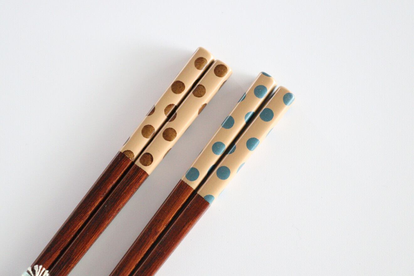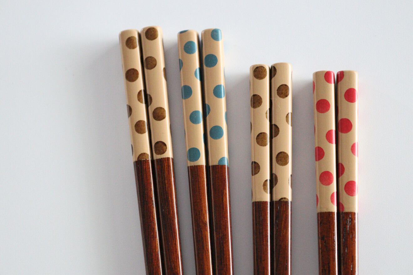 箸の上部に水玉の絵付けが施された、睦さんの個性が感じられるデザインでとってもかわいらしい拭き漆箸です。