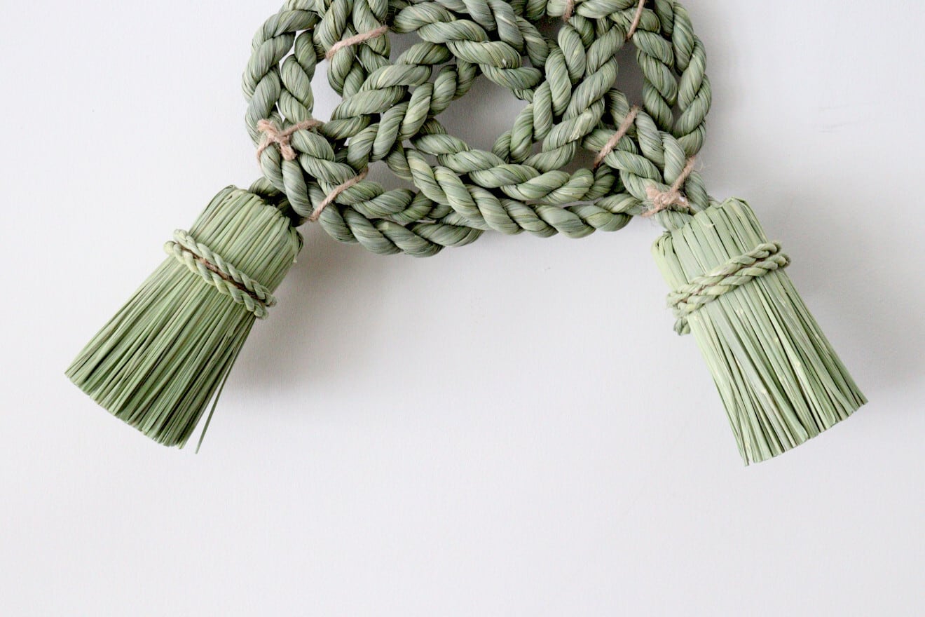しめ飾りには稲穂が実る前の初夏に刈った青わらを使用しています。