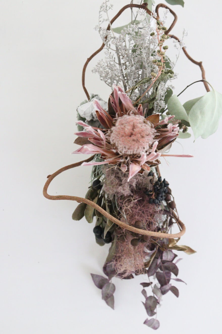 プロテアというネイティブフラワーを使用したオブジェ風のスワッグ。