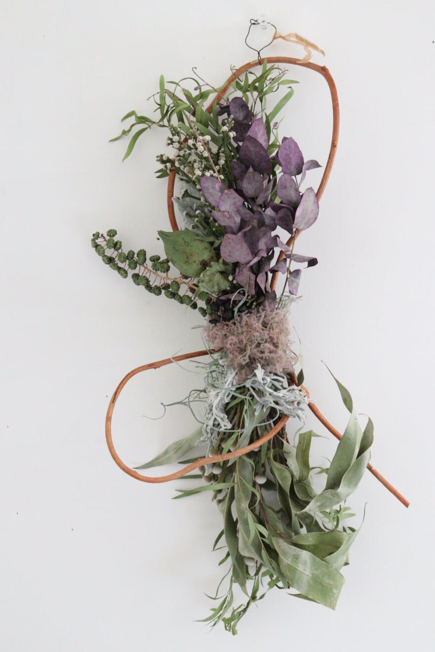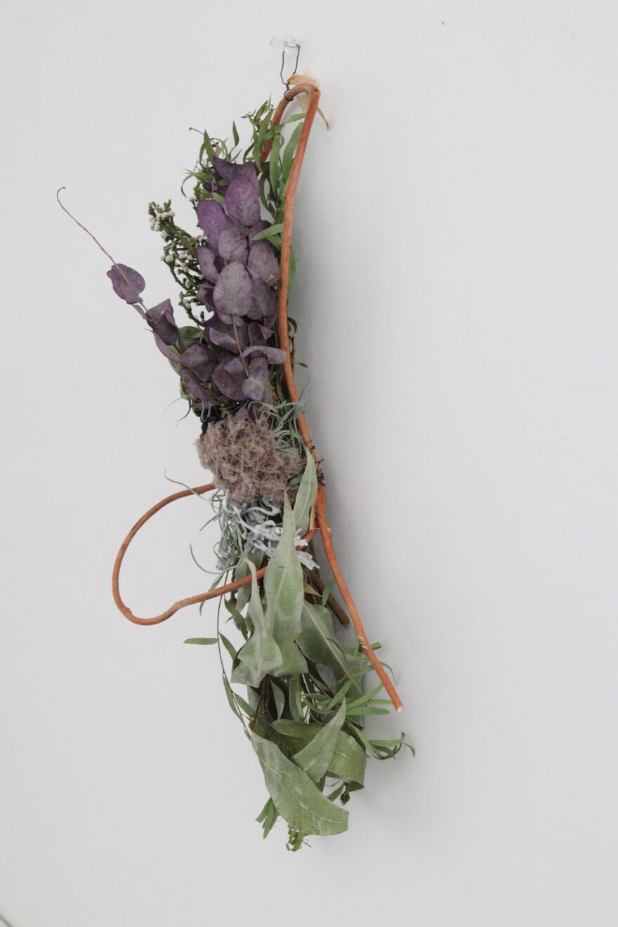 今展のためにお願いして制作してもらったリースとスワッグの間のような、壁に掛けるオブジェをイメージしたカタチのスワッグです。