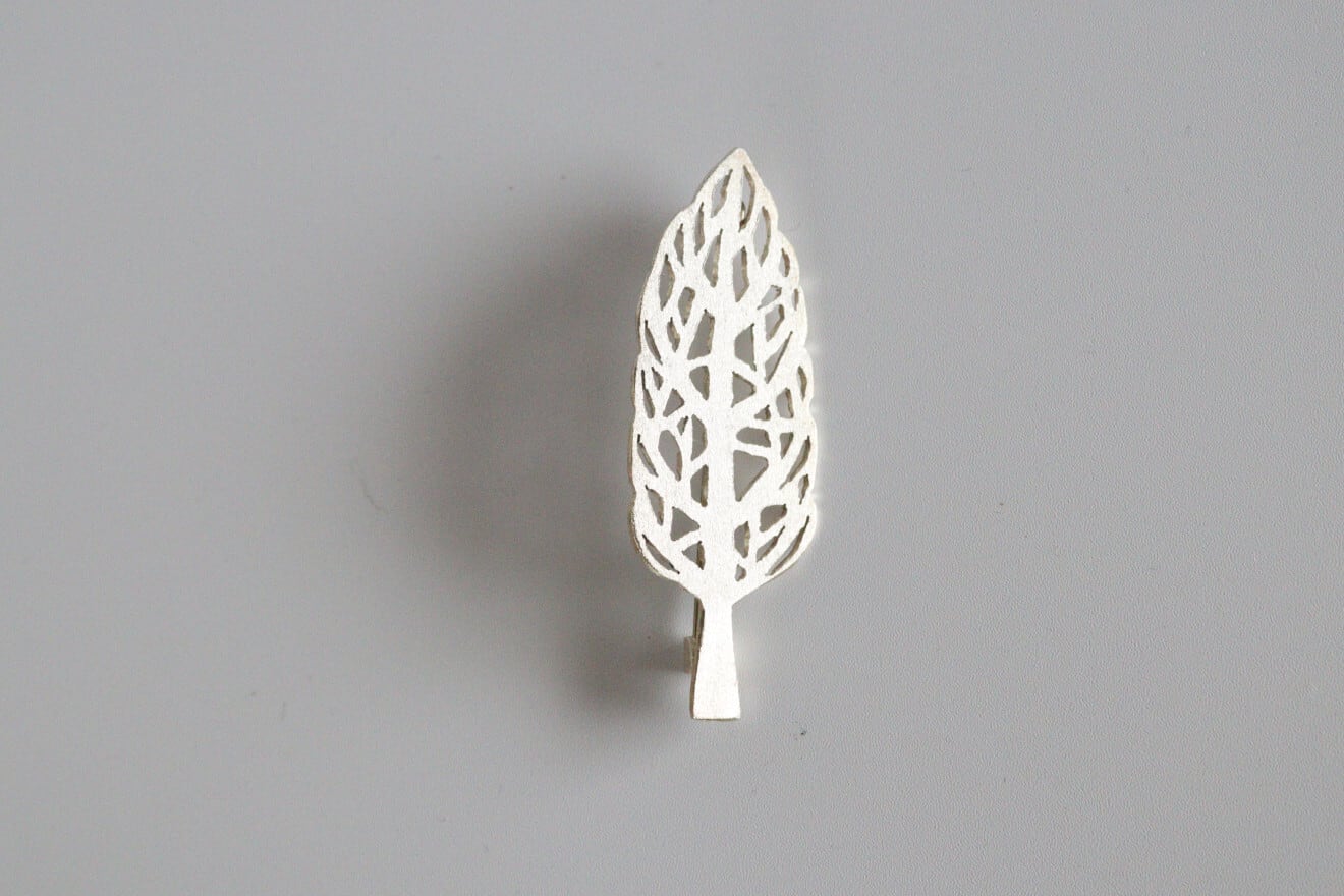 イチョウの木をモチーフにしたブローチは、季節の美しさを引き立てくれるような静かな輝きがあって、さりげなく胸元を彩ってくれます。