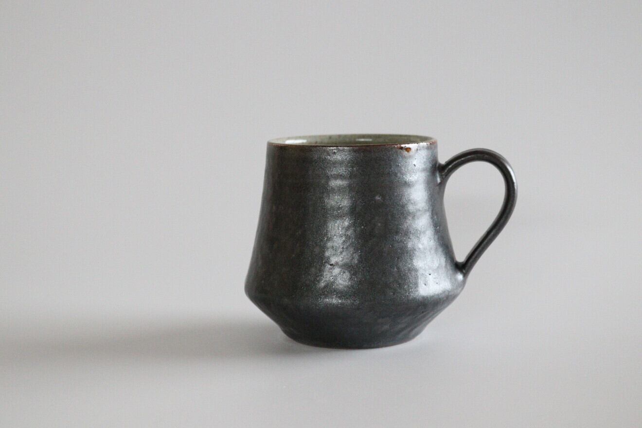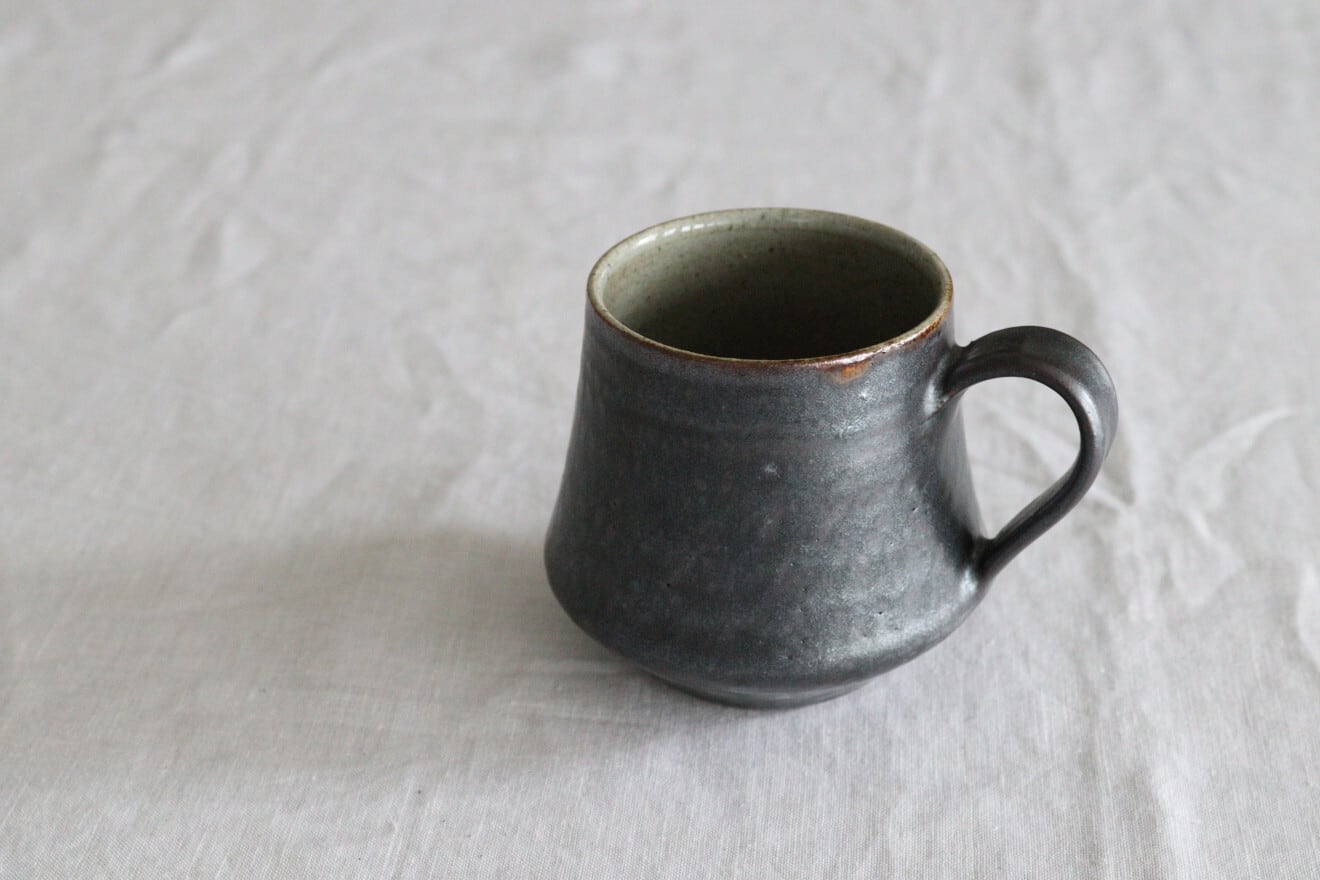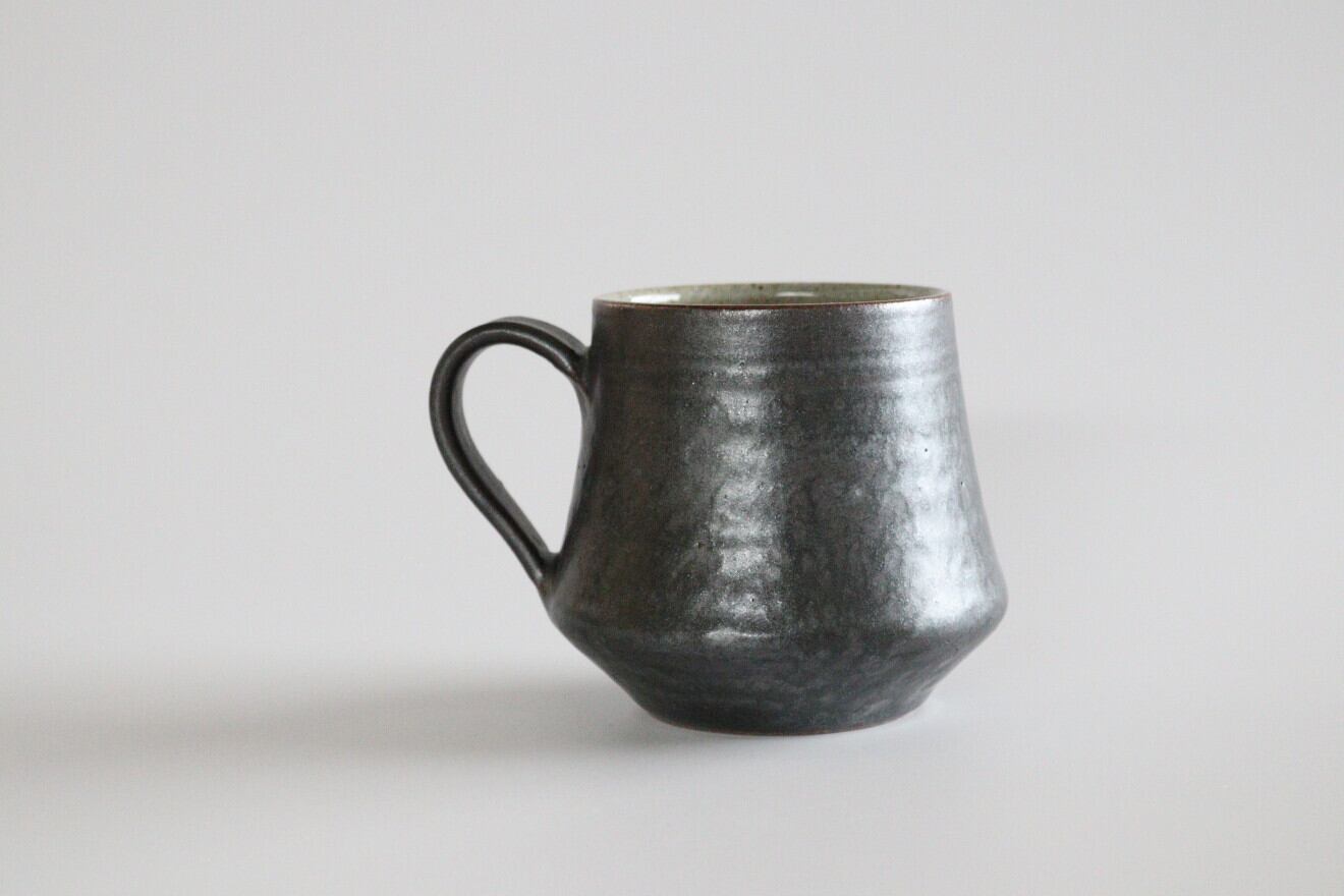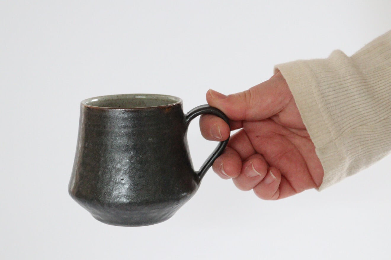 外側に黒色のマットな釉薬を施していて、落ち着きのある風合いのマグカップです。