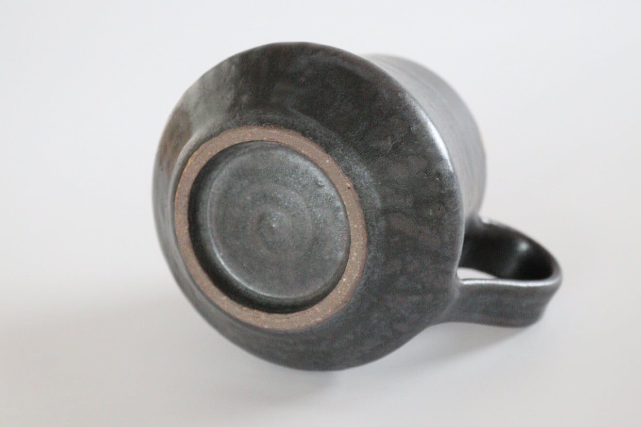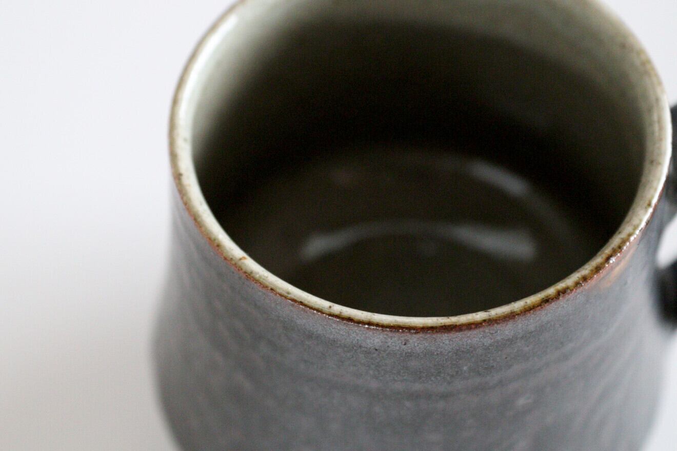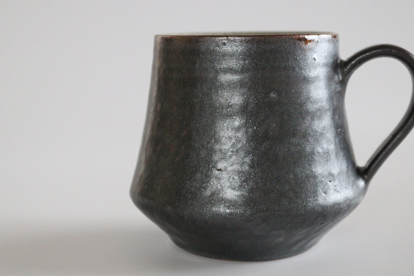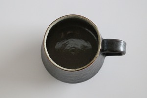 外側に黒色のマットな釉薬を施していて、落ち着きのある風合いのマグカップです。