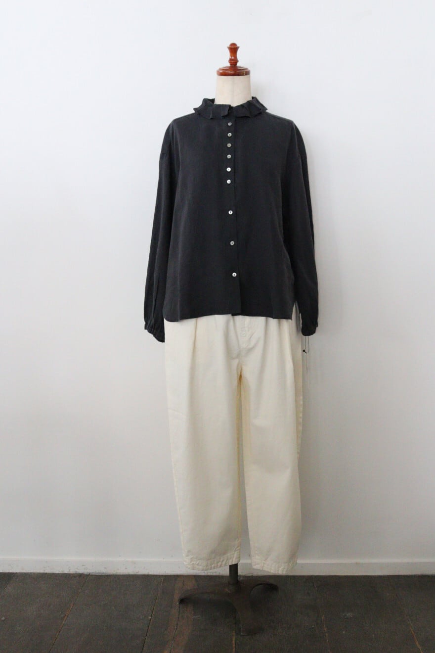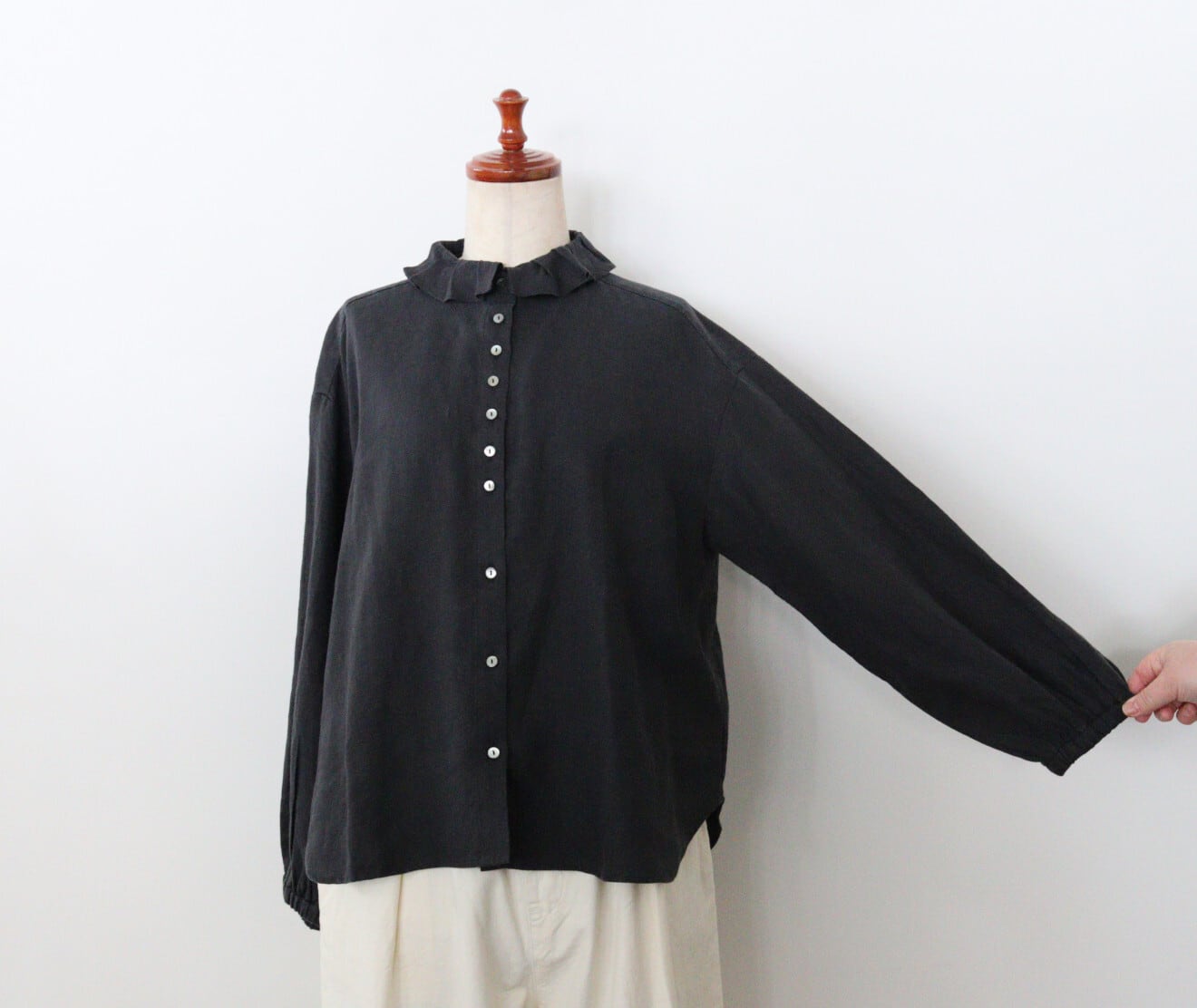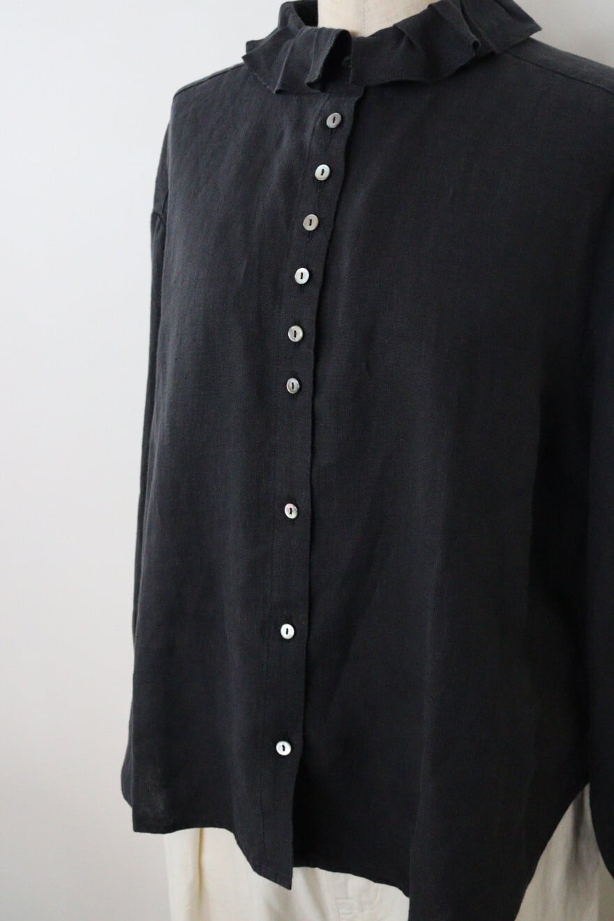 襟元のタックフリルカラーとリズミカルなシェルボタンが素敵な一枚。