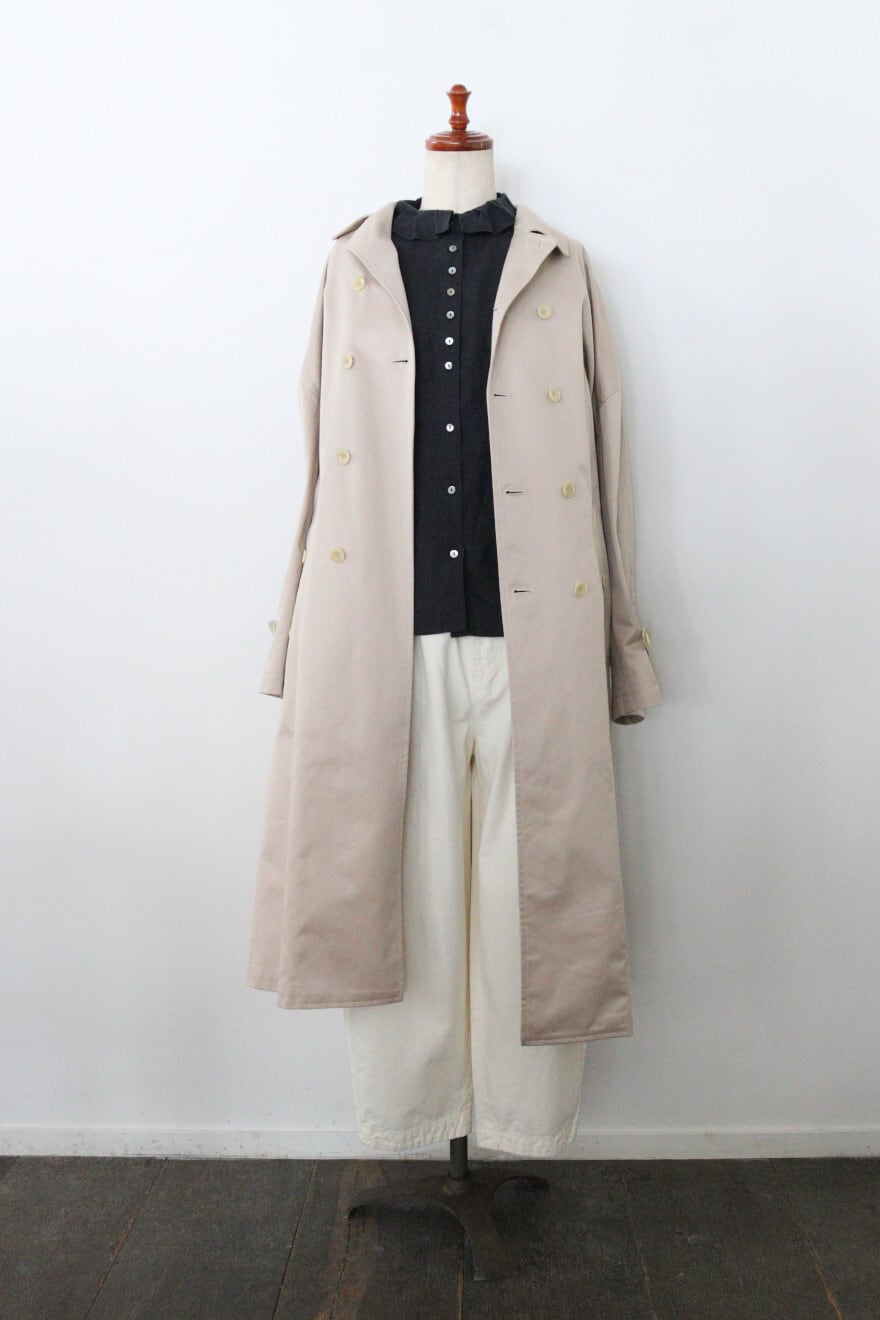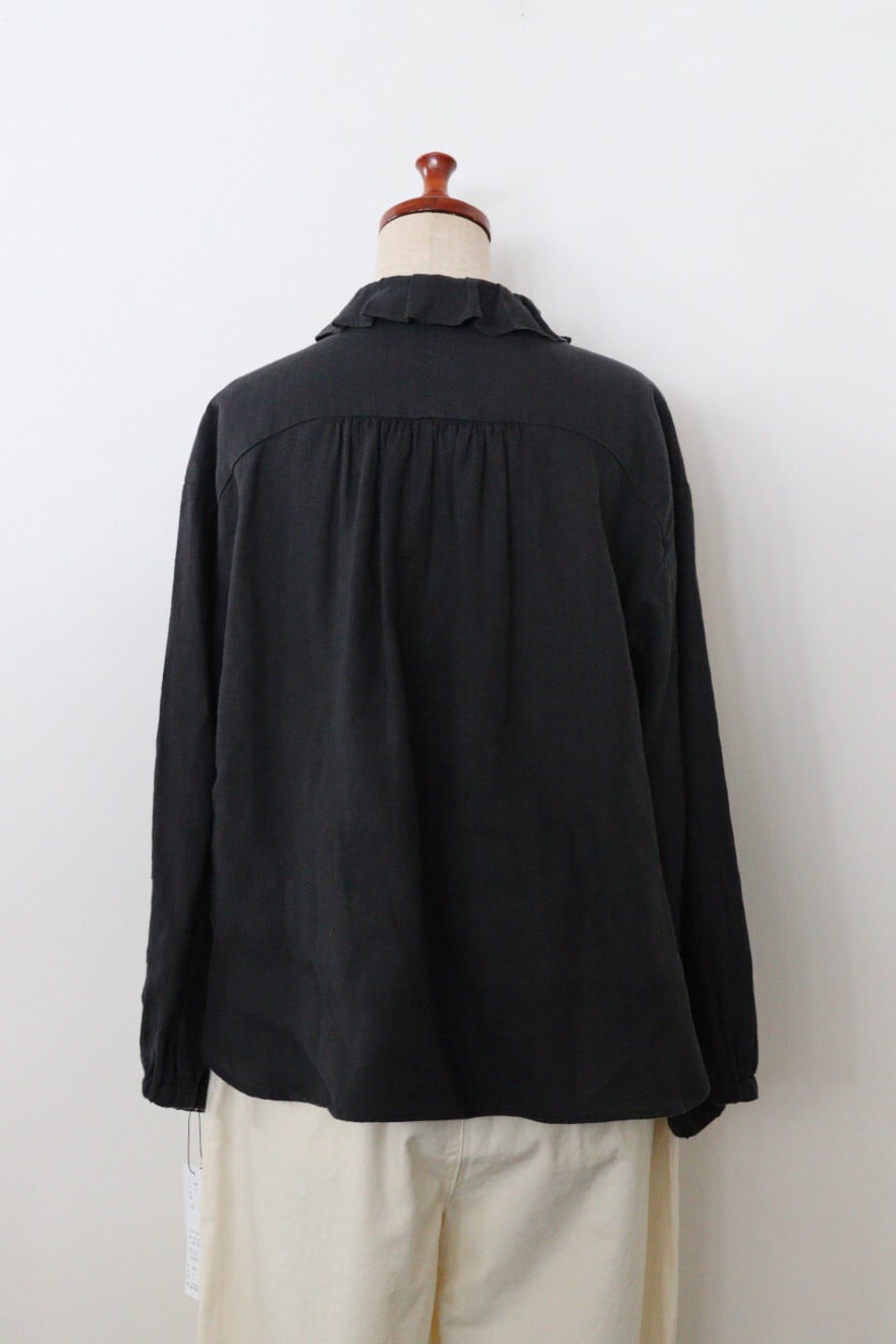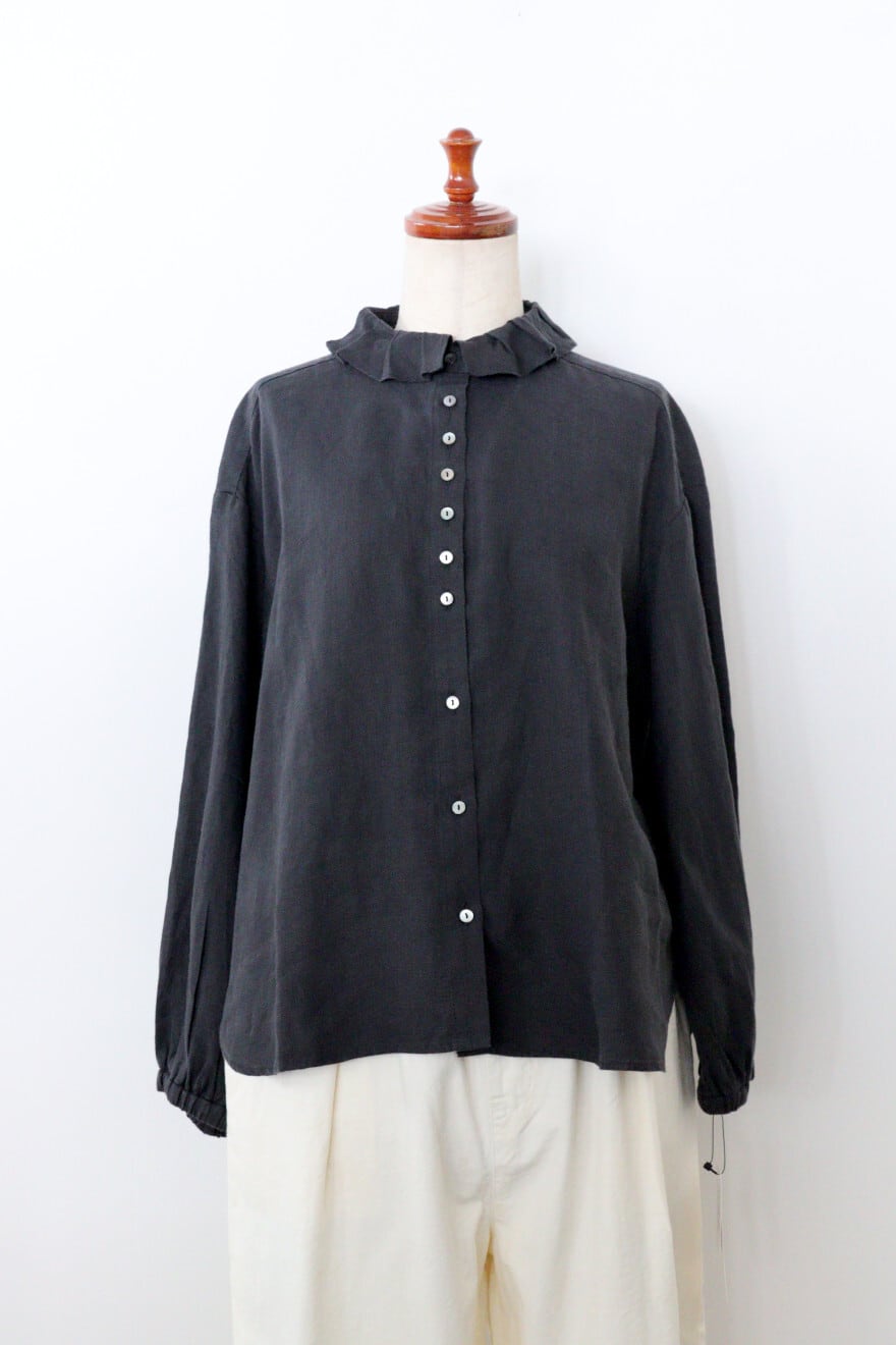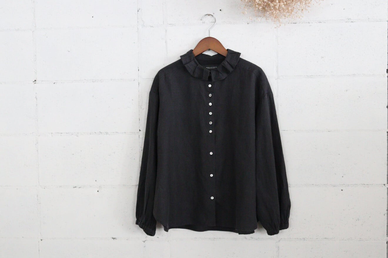 襟元のタックフリルカラーとリズミカルなシェルボタンが素敵な一枚。