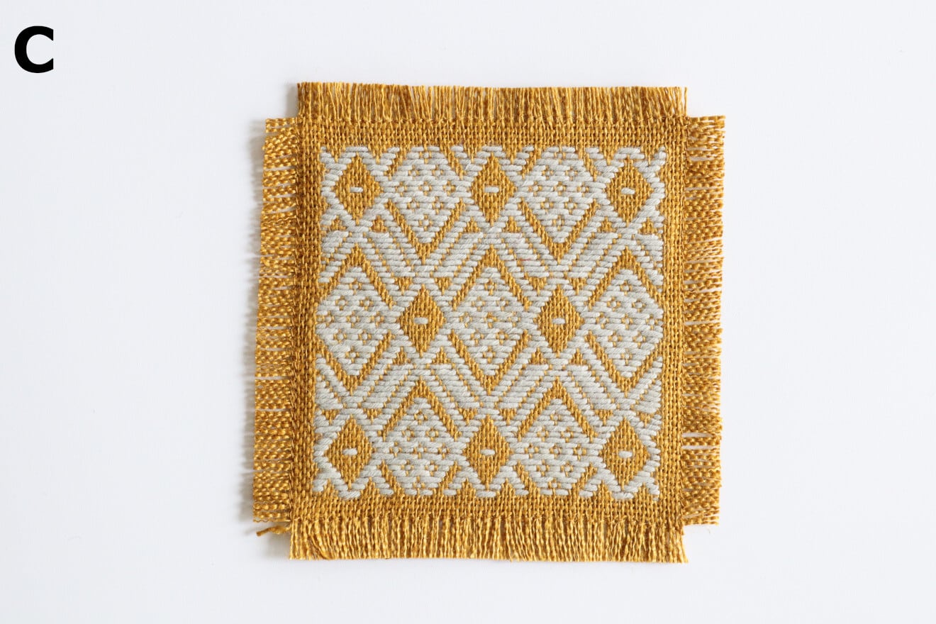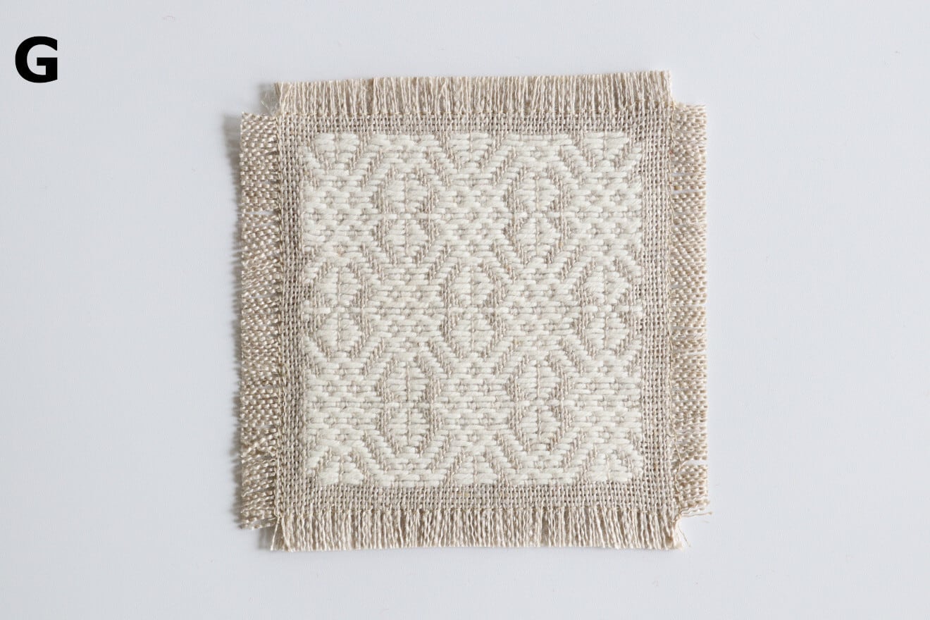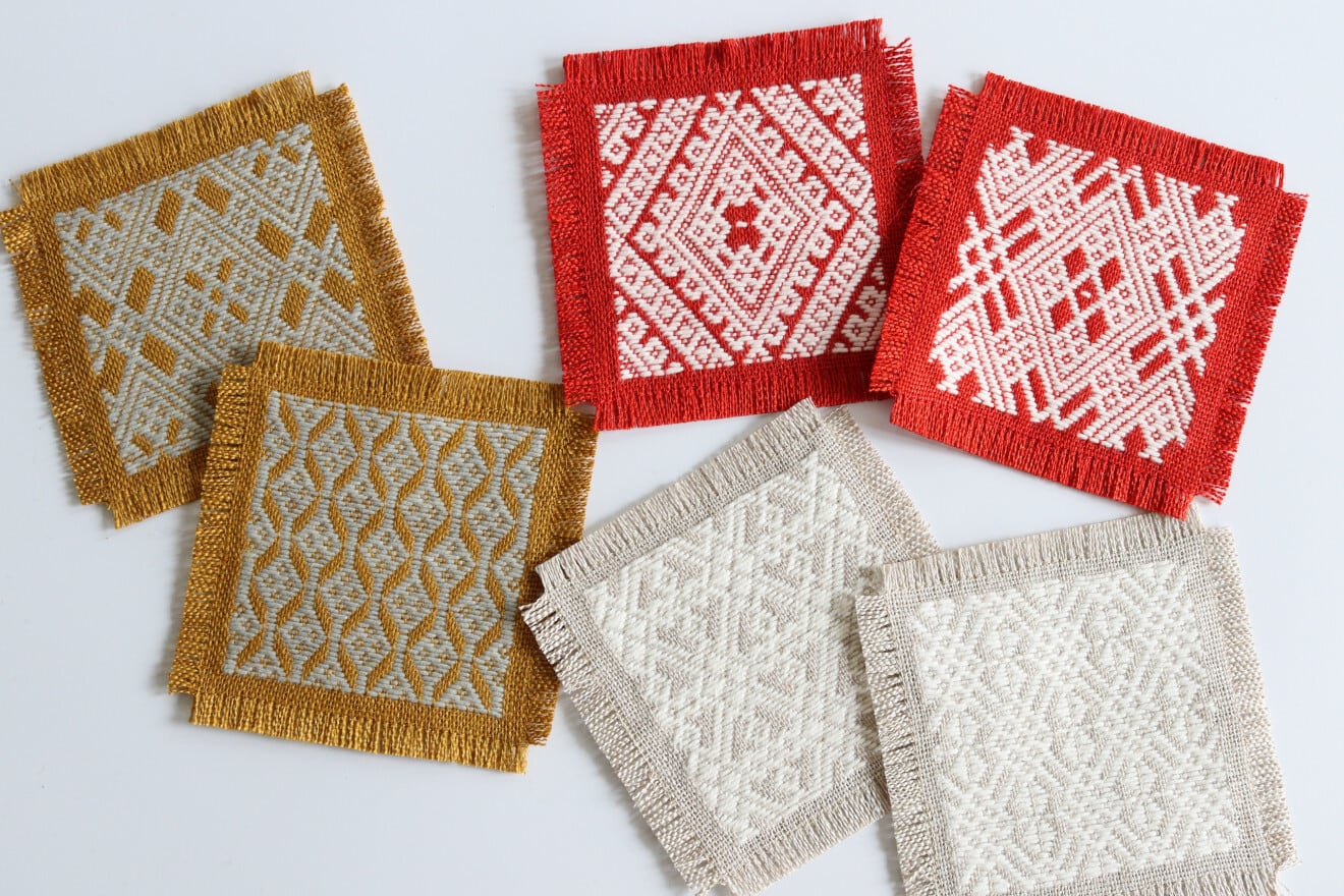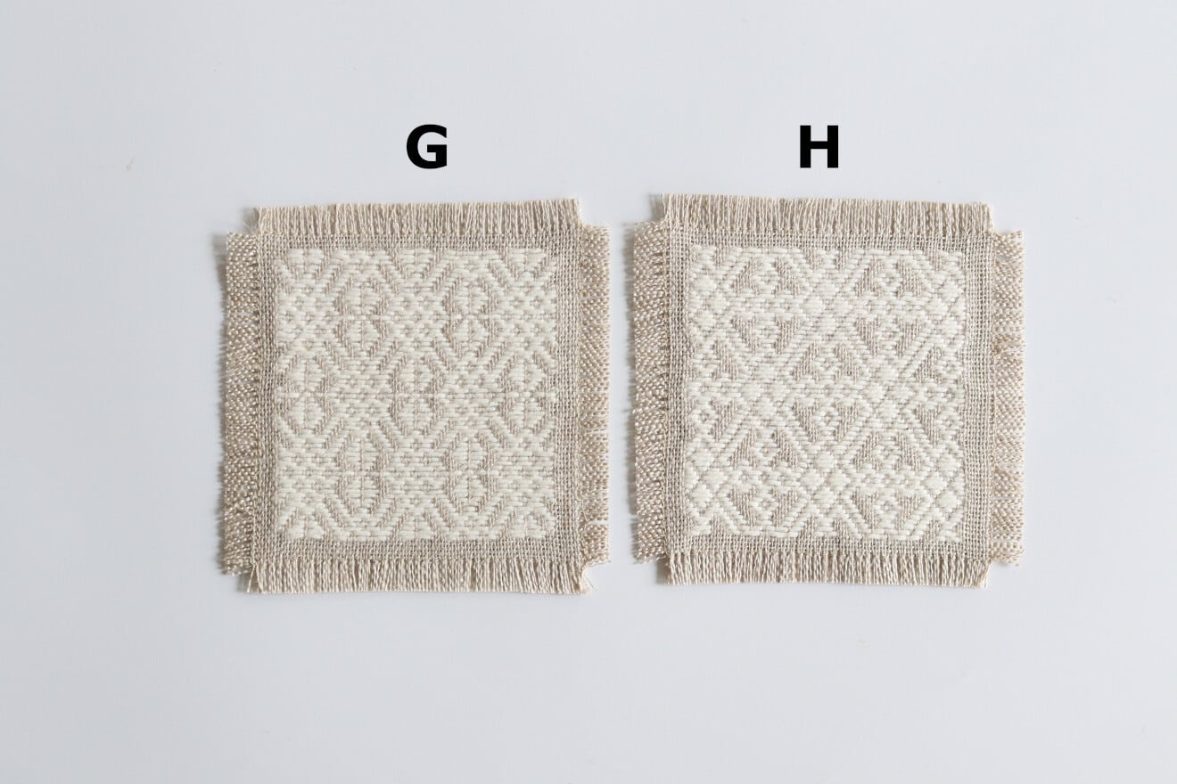 麻の生地に木綿糸で一針一針丁寧に刺したこぎん刺しのコースター。