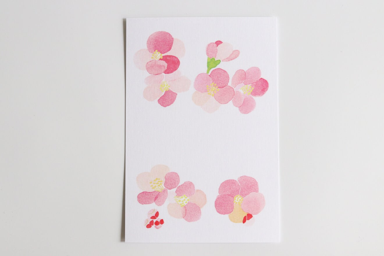 春の訪れを告げる木瓜の花を描いたポストカード。