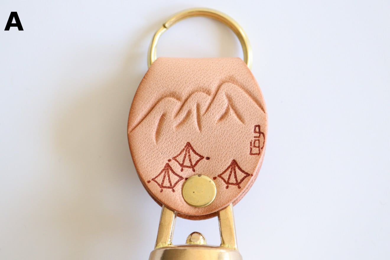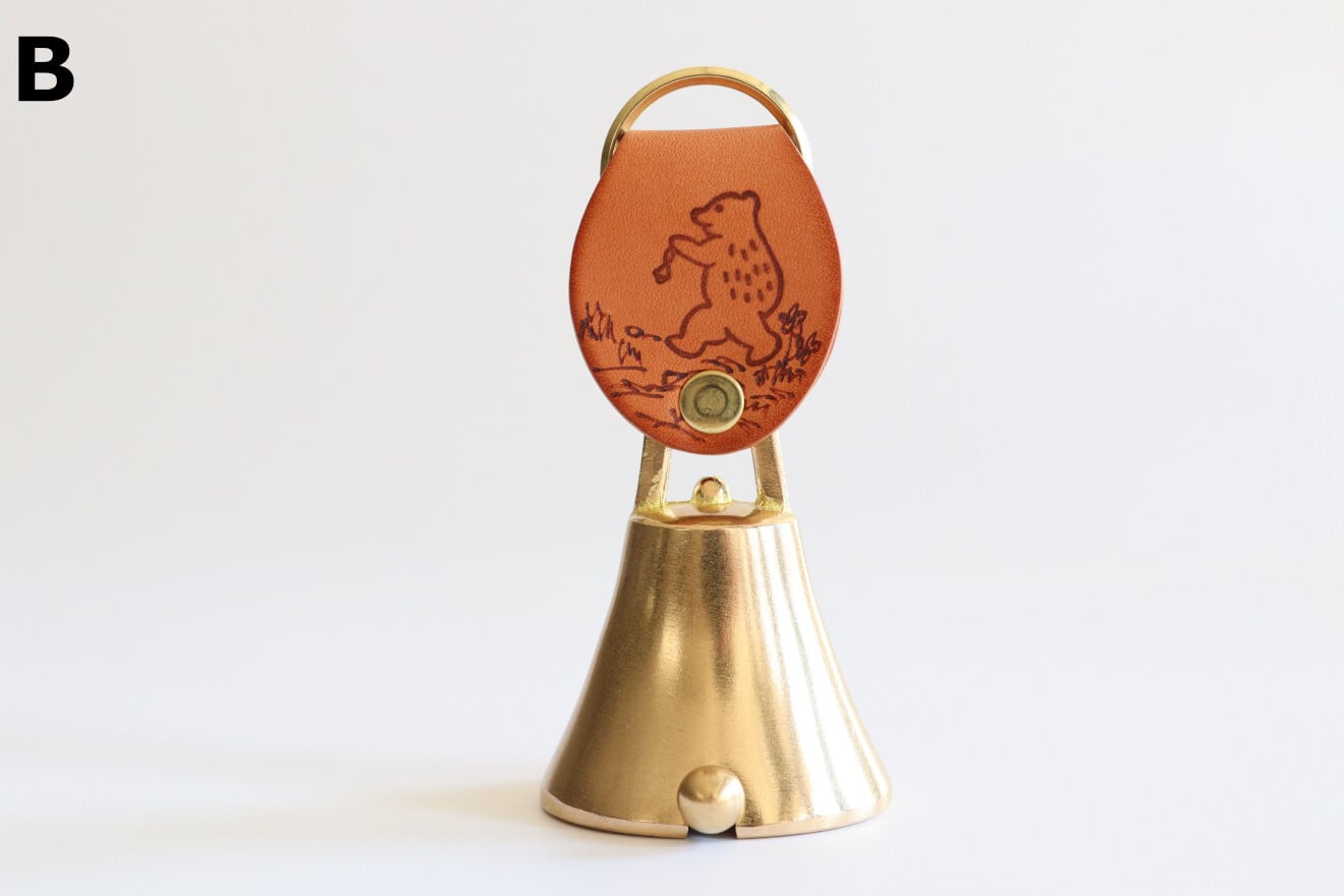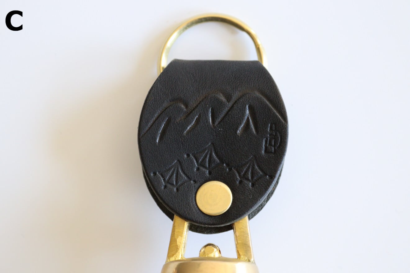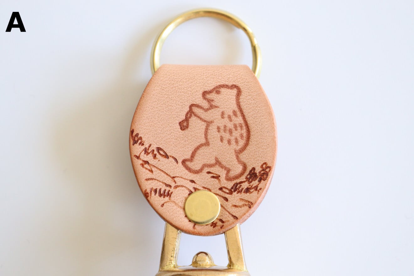 革には片面に可愛らしいクマが、もう片面には富山県の飛騨山脈北部にある立山が手彫りされています。