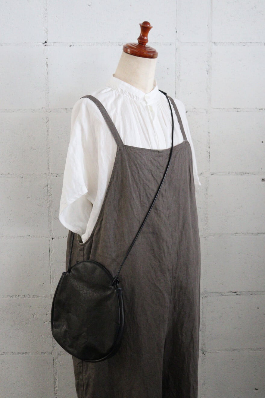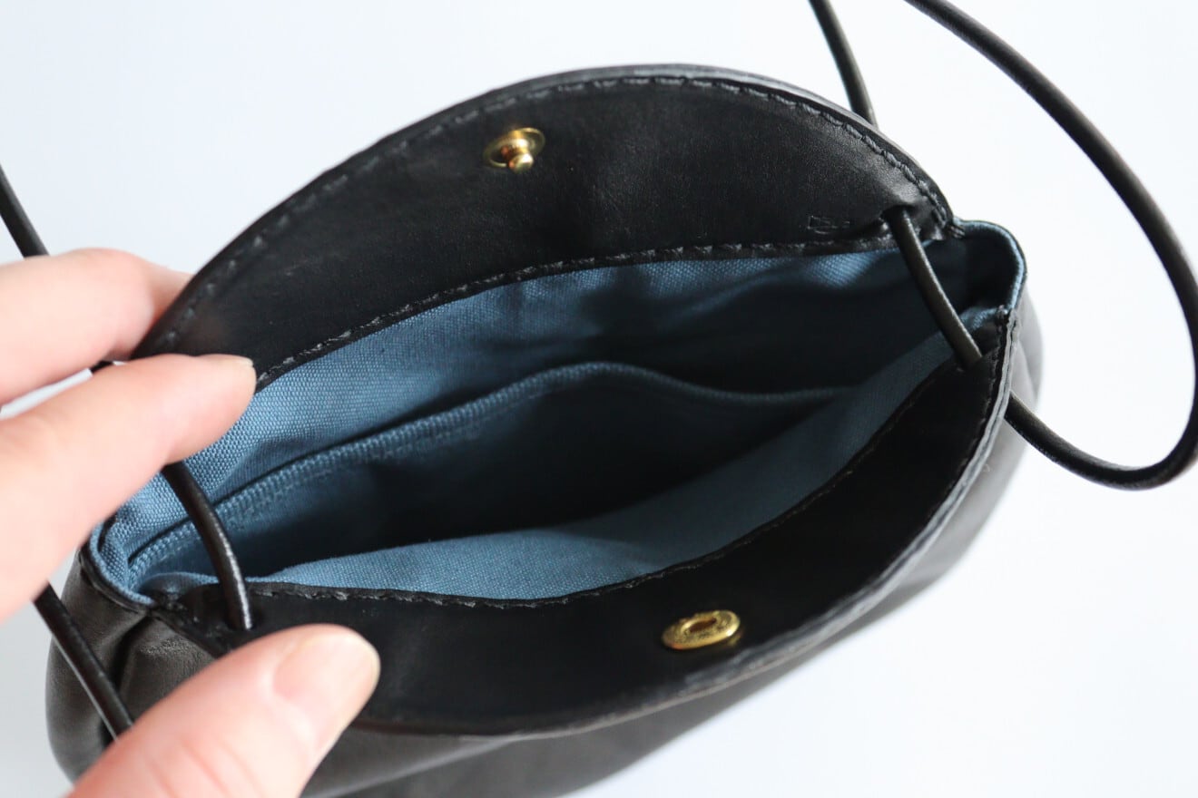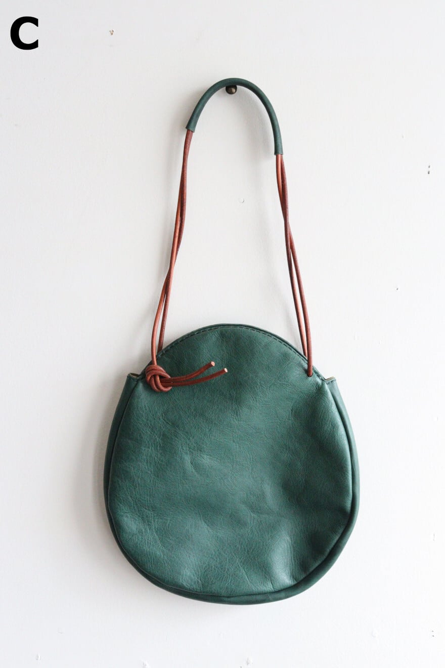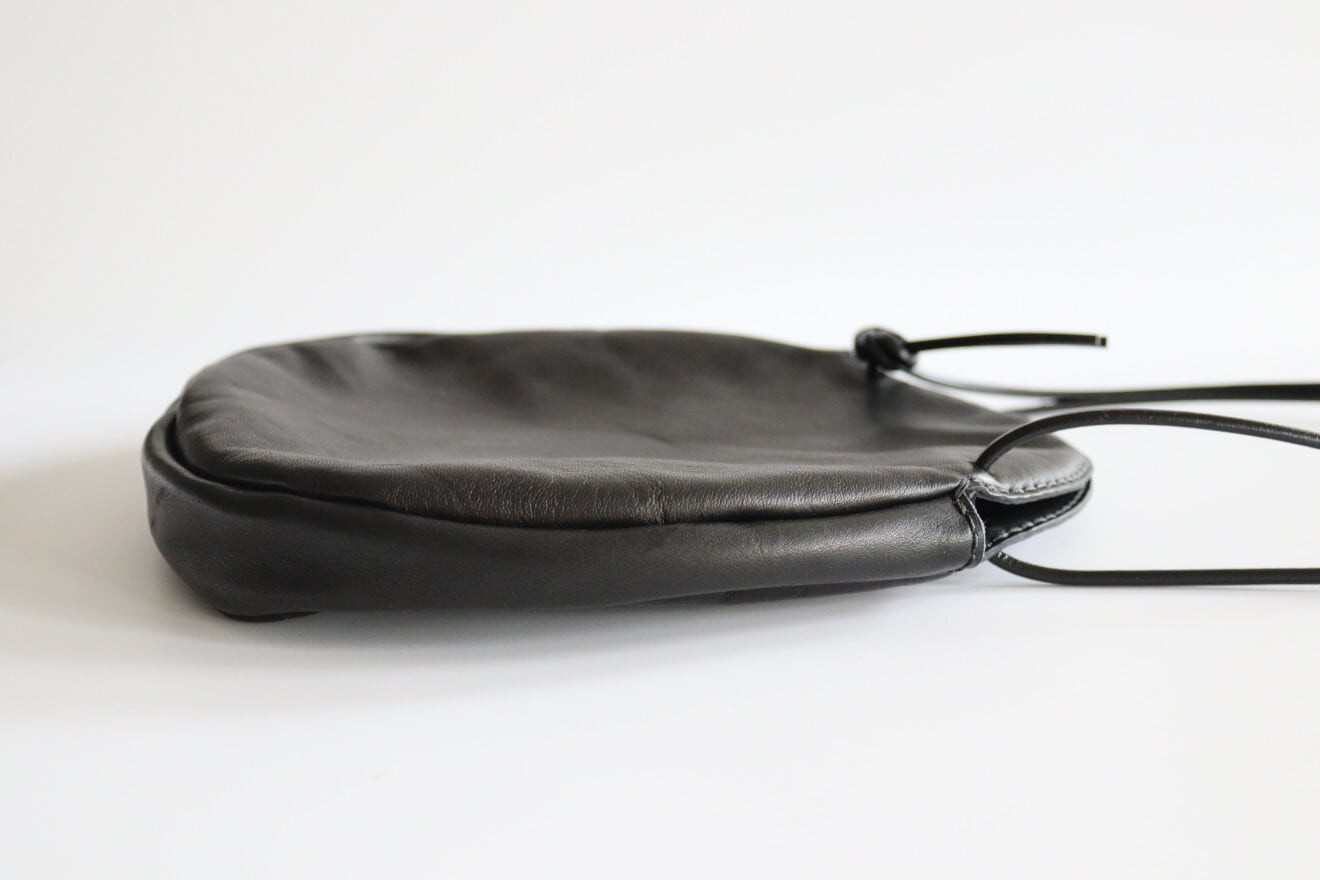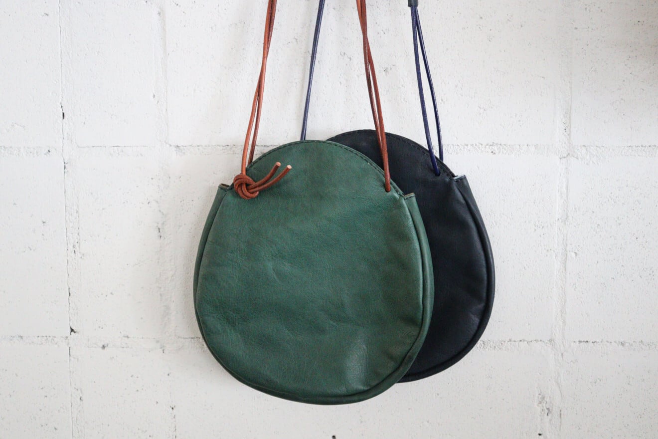 革ひもの結び方で肩掛けや手提げなどいろいろと楽しめるカタチになっています。