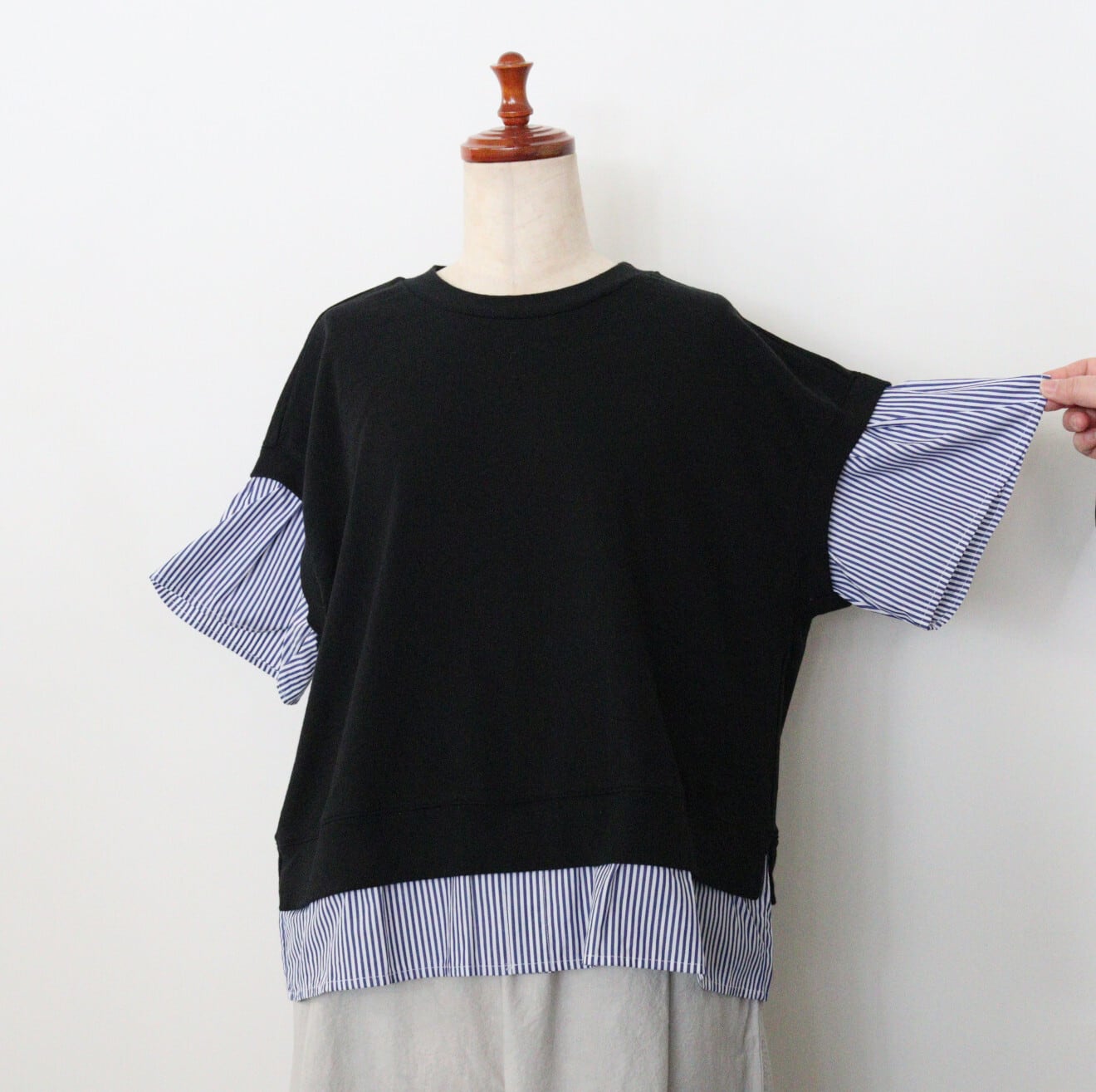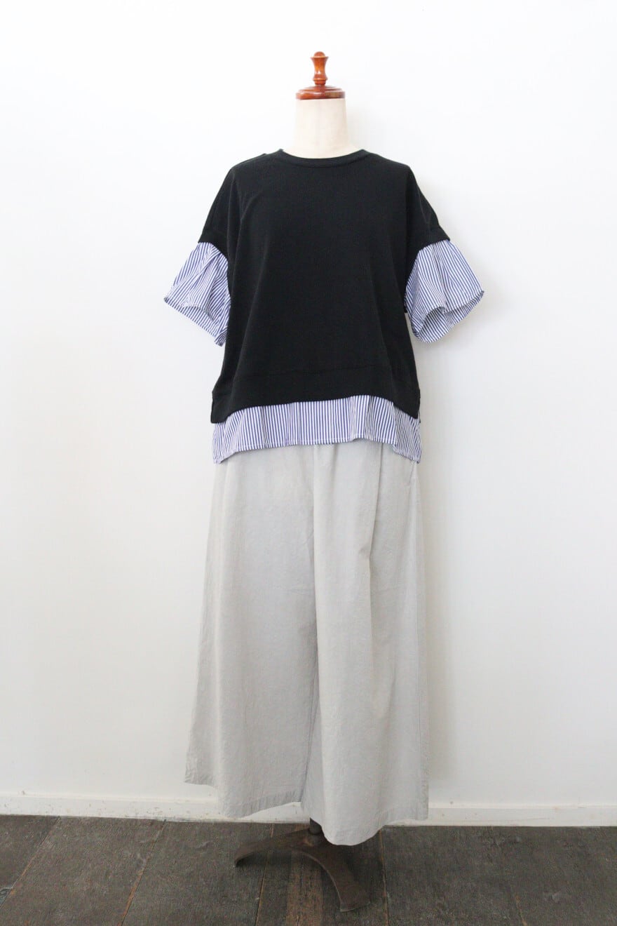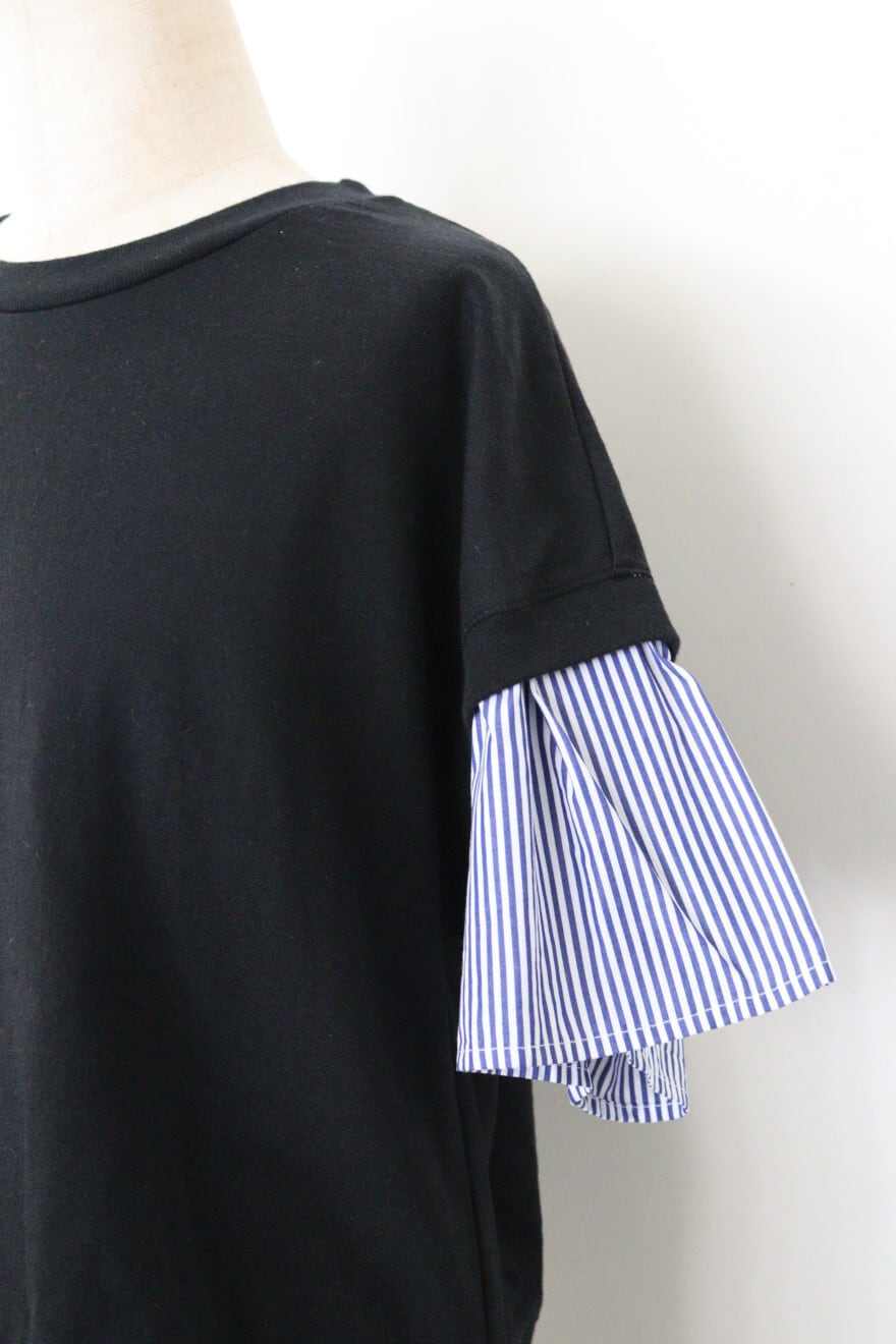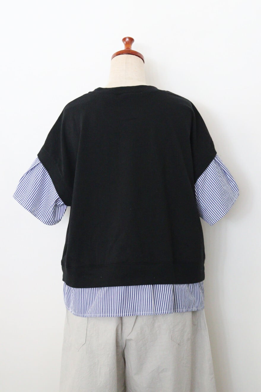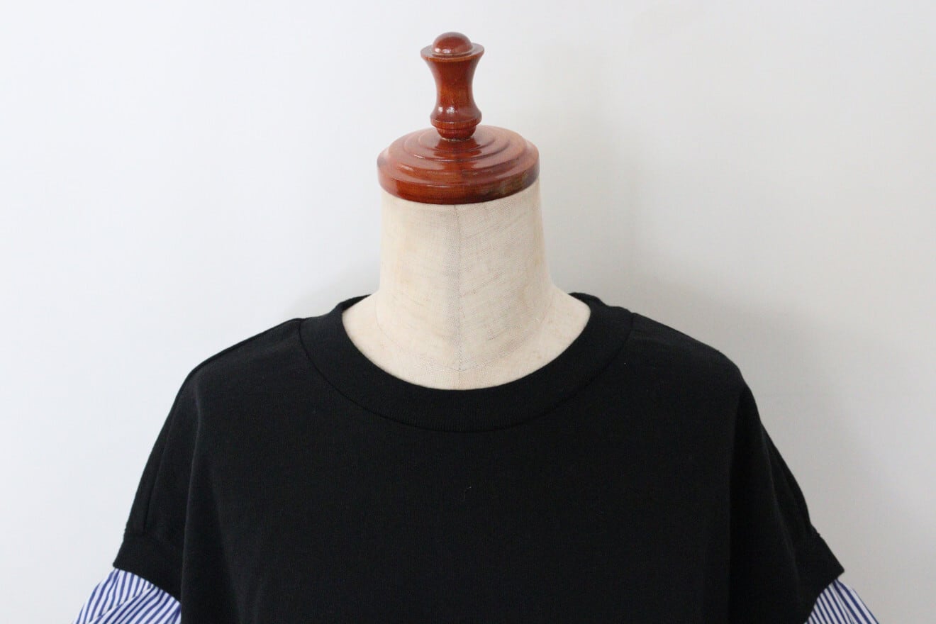 universal tissuストライプコンボハーフスリーブPO 素材:コットン100% サイズ:着丈57cm 身幅56㎝ 裄丈48cm カラー:クロ×ネイビーストライプ 程よい厚みとドライタッチが特徴のアメリカンコットン生地とストライプ柄のハリ感のあるタイプライター生地のコンビのTシャツです。 一枚で重ねたようなデザインが印象的。 透け感も気にせず一枚でさらりと着用できます。