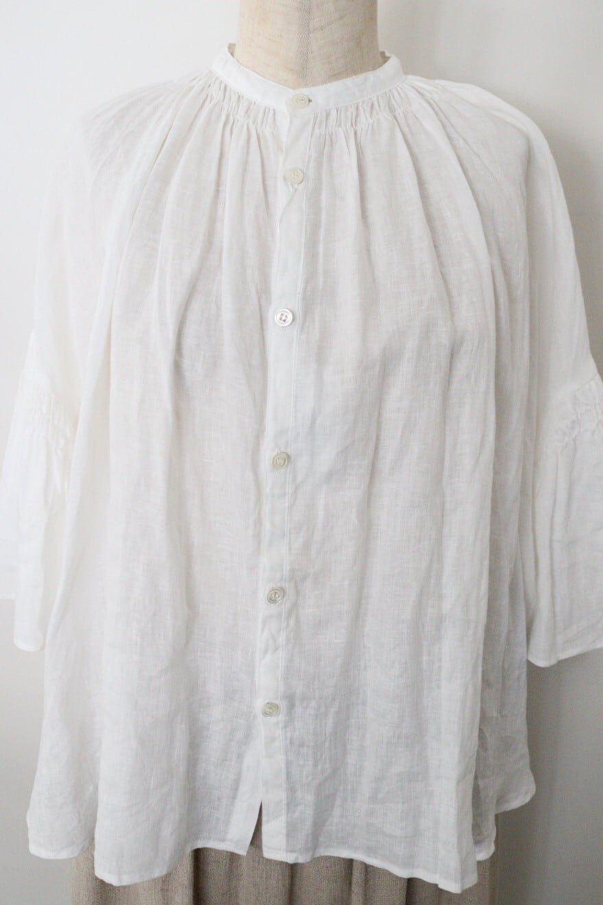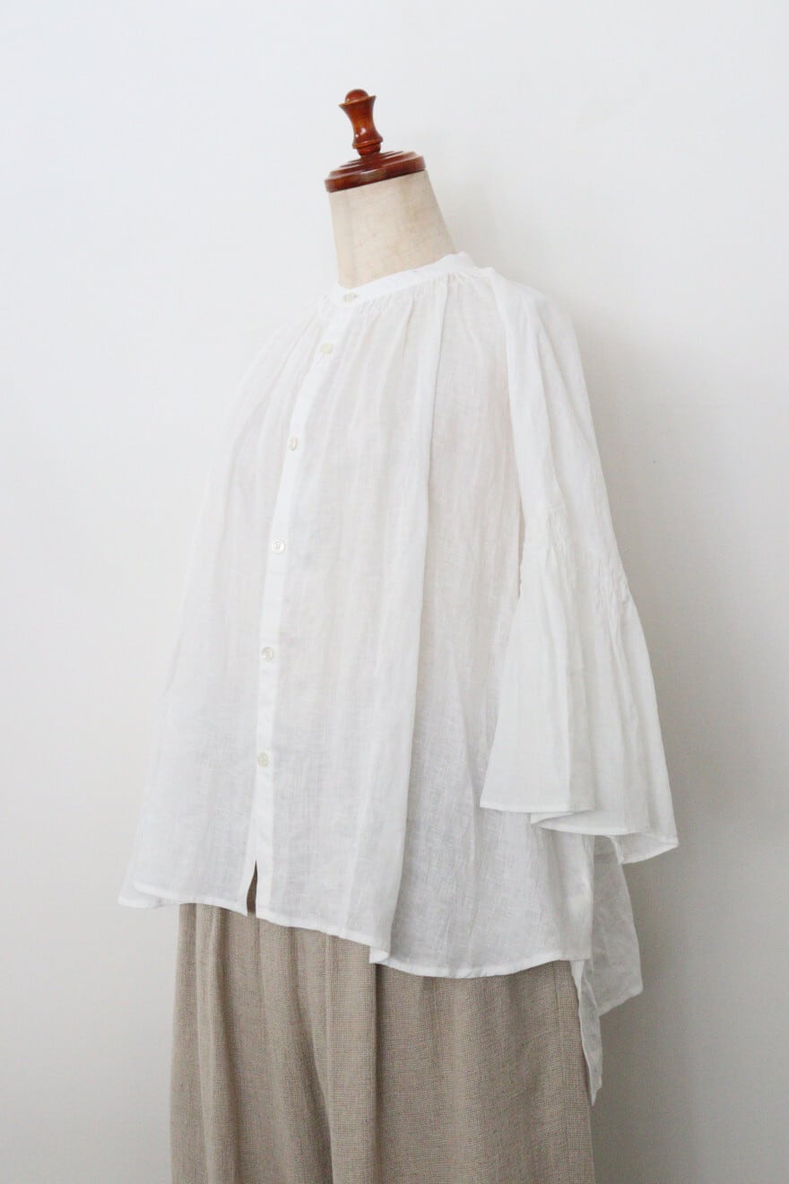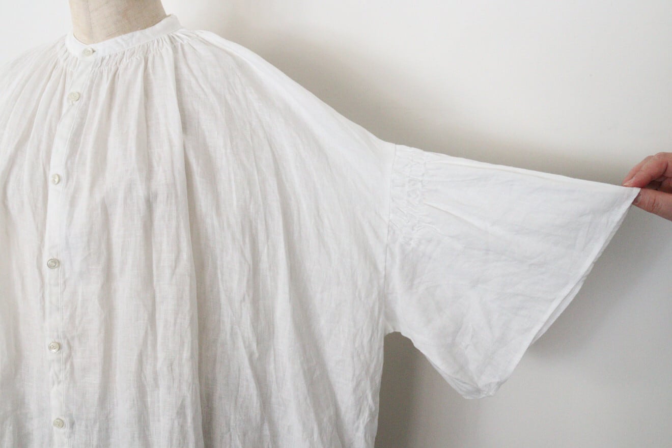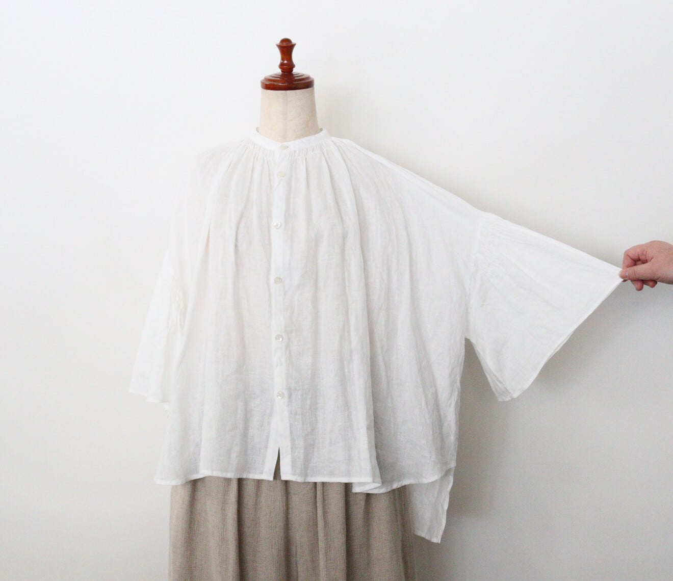 universal tissuフレンチリネン フレアスリーブシャーリングBL 素材:リネン100% サイズ:F 着丈 前60㎝ 後66cm 身幅81㎝ 裄丈62㎝ カラー:オフ 衿ぐりと袖山部分にシャーリングを施したフレアスリーブブラウス。 しなやかでなめらかな肌触りのフレンチリネンを使用し、フレアに広がるスリーブが軽やかに揺れます。 肘が隠れる6分袖で、夏の日よけやあまり肌を出したくない方にも◎ 暑い季節にもさらり気持ちよく着て頂ける一枚です