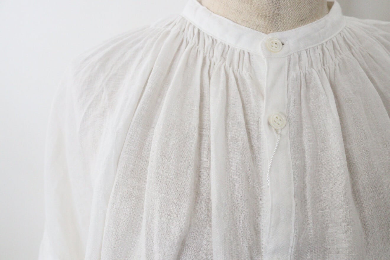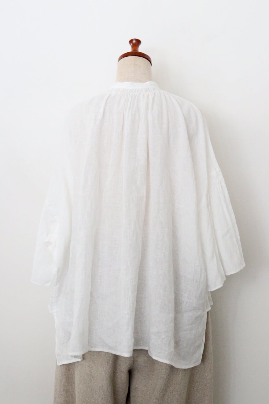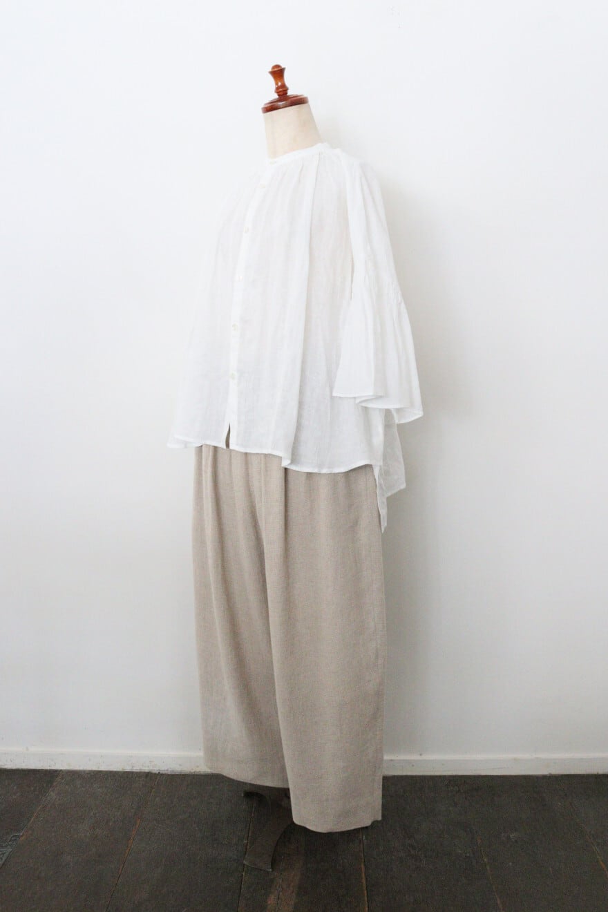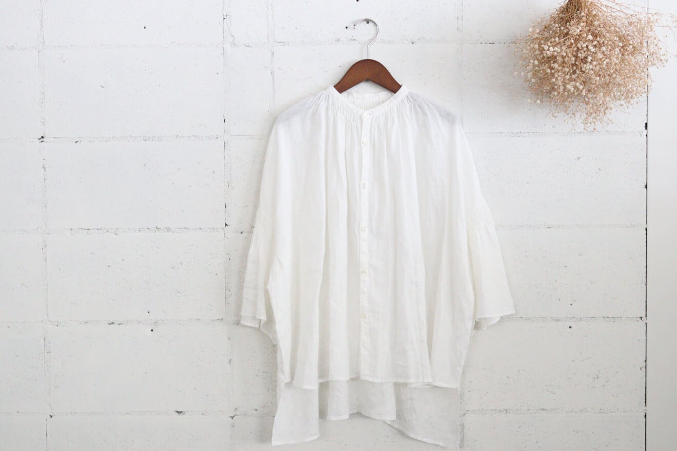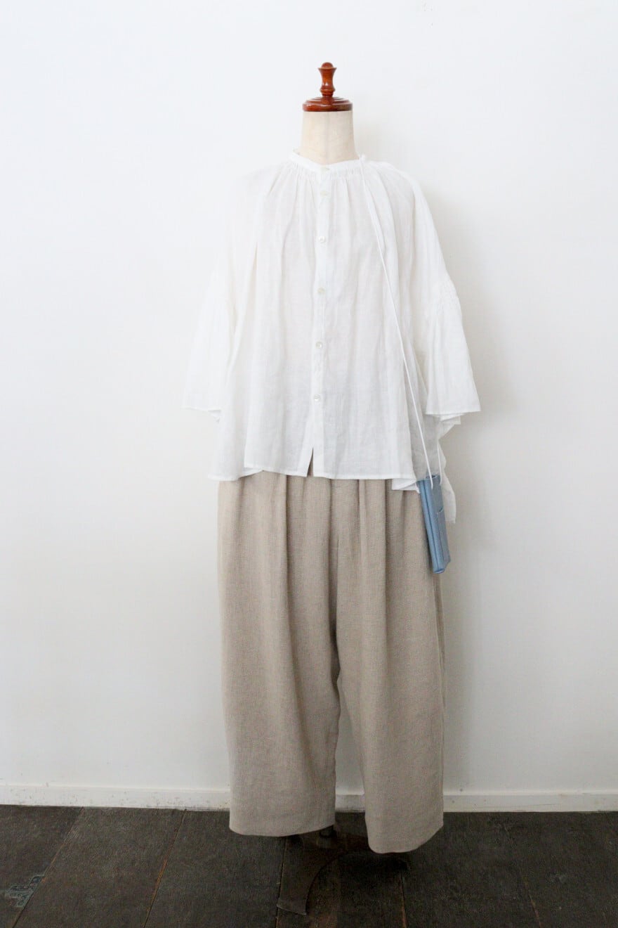 universal tissuフレンチリネン フレアスリーブシャーリングBL 素材:リネン100% サイズ:F 着丈 前60㎝ 後66cm 身幅81㎝ 裄丈62㎝ カラー:オフ 衿ぐりと袖山部分にシャーリングを施したフレアスリーブブラウス。 しなやかでなめらかな肌触りのフレンチリネンを使用し、フレアに広がるスリーブが軽やかに揺れます。 肘が隠れる6分袖で、夏の日よけやあまり肌を出したくない方にも◎ 暑い季節にもさらり気持ちよく着て頂ける一枚です