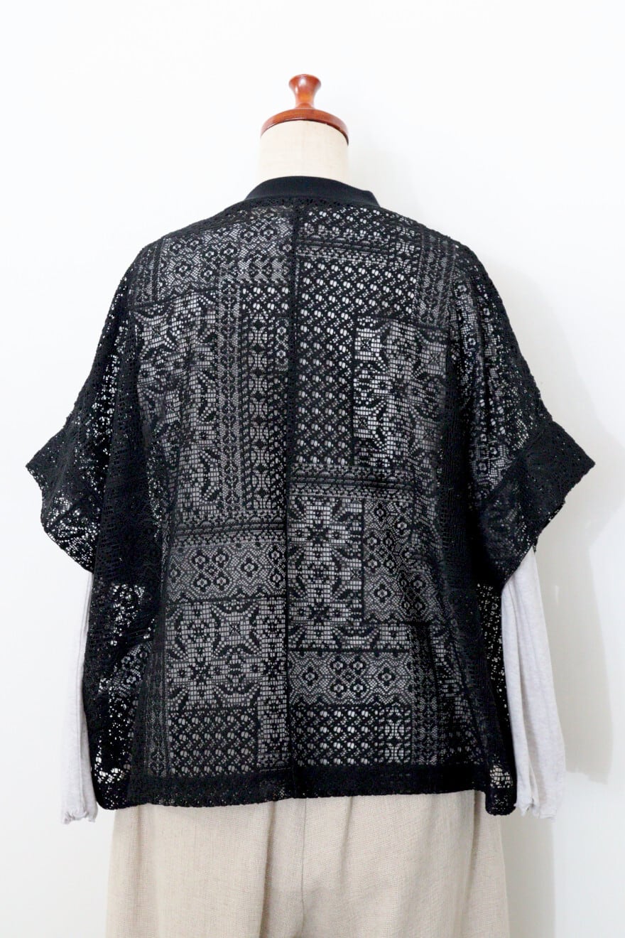 特殊な編み機で丁寧に仕立てた、異なる編み柄が連なるレースがパッチワークされたような一枚。