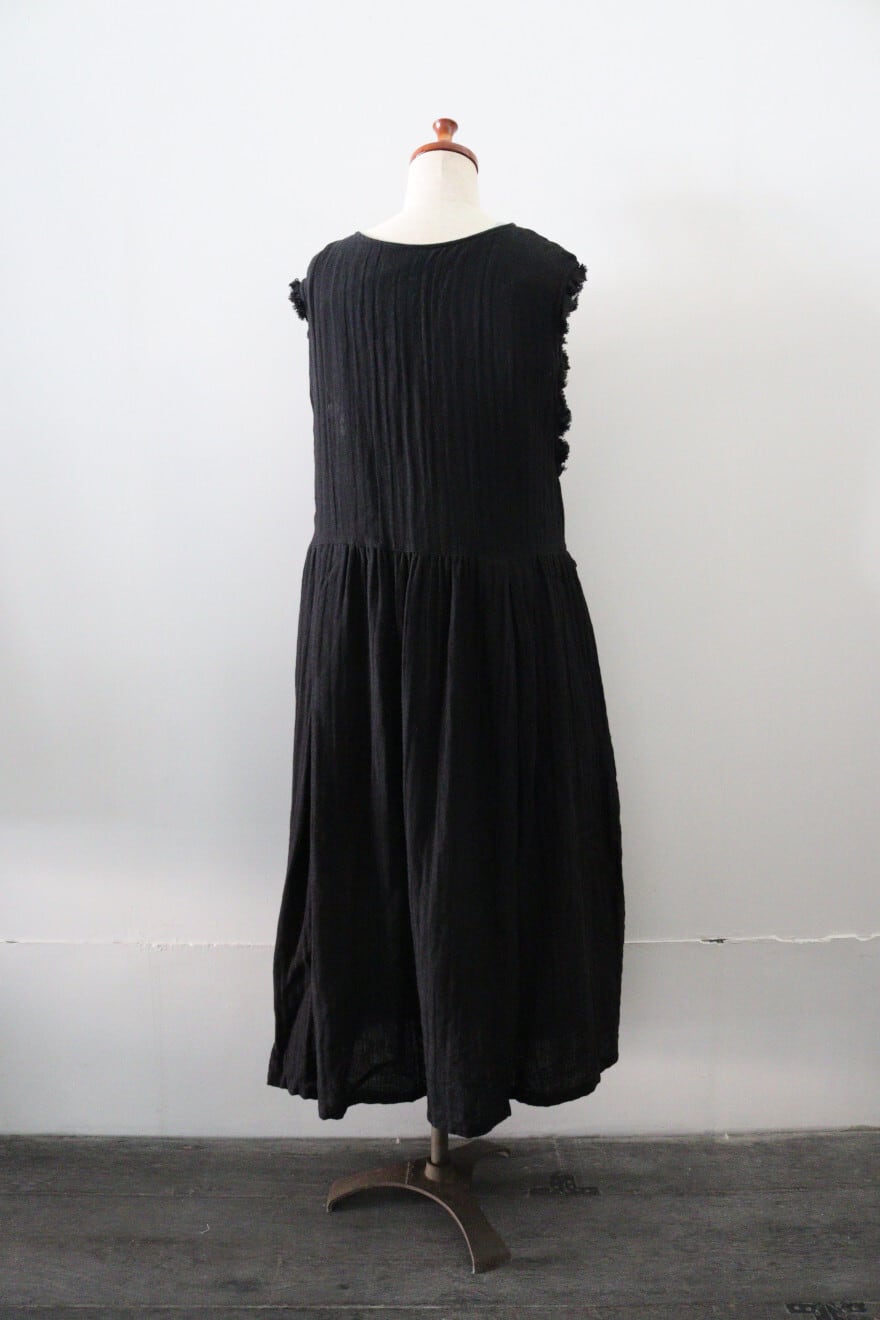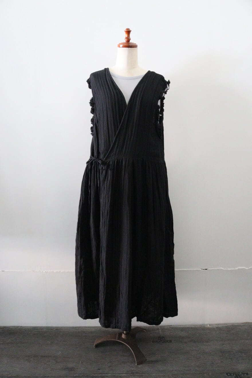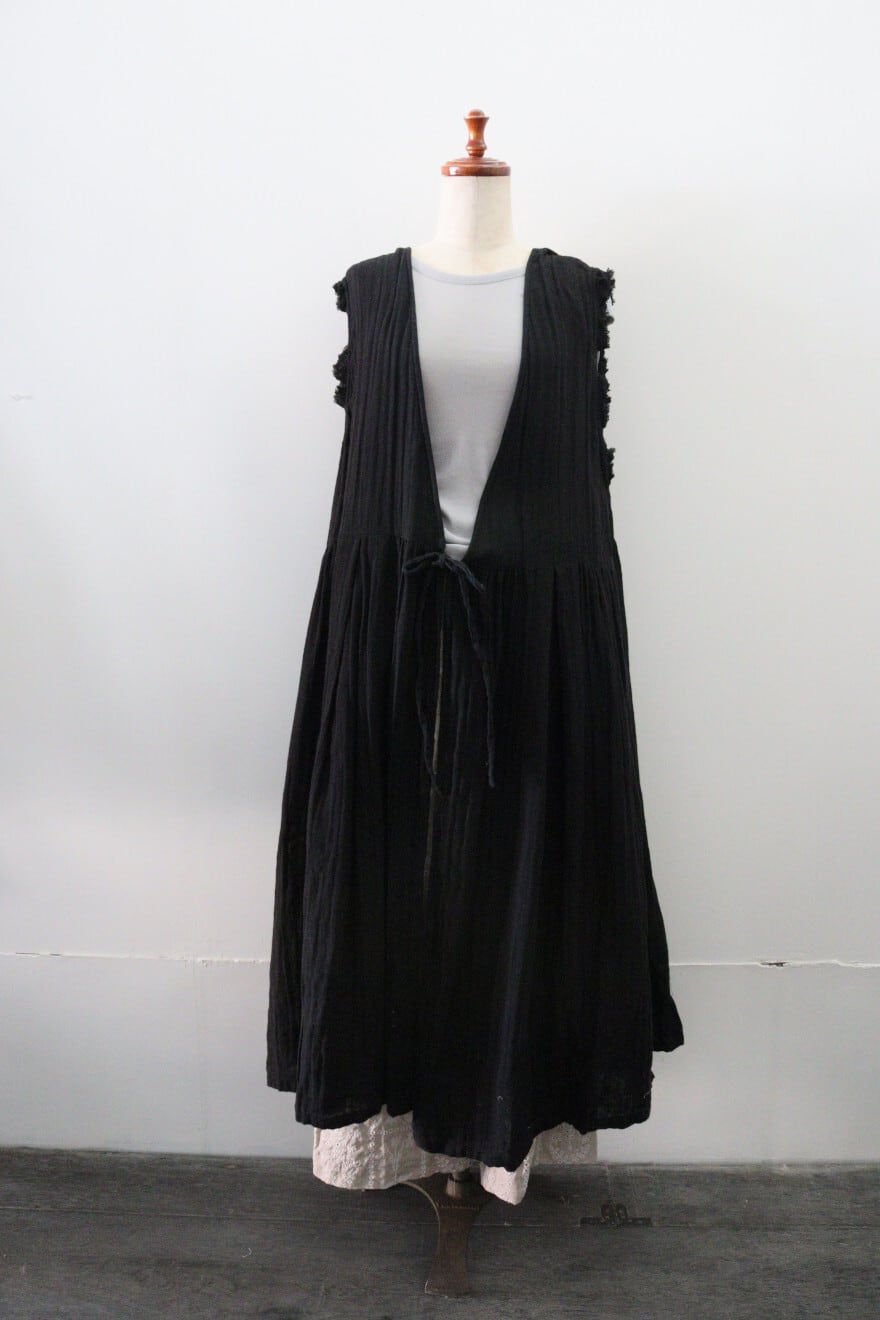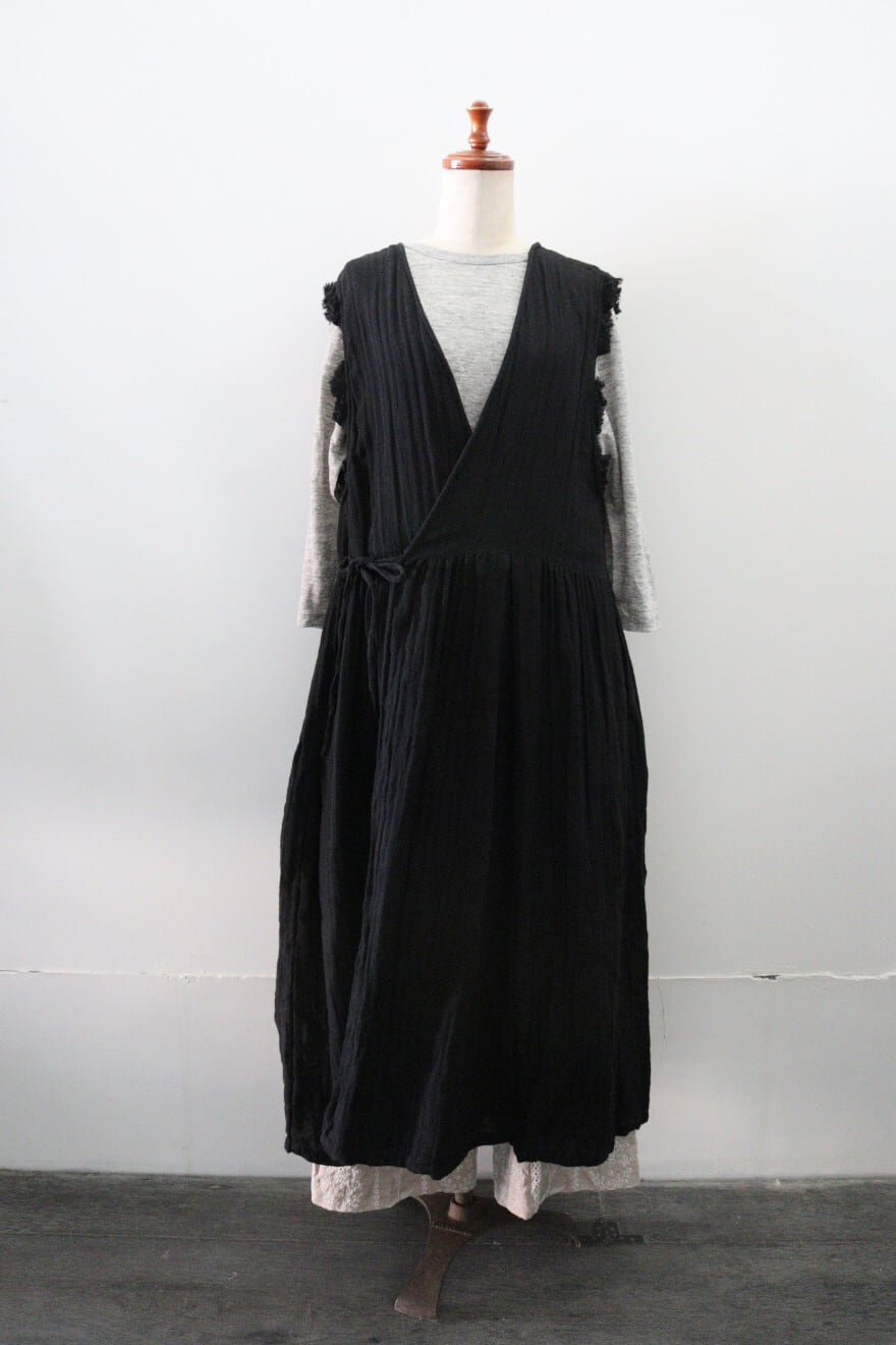 gauze# DOUBLE GAUZE CACHE COEUL DRESS 素材:コットン50%リネン50% サイズ:F 着丈115 身幅50cm カラー: ブラック ナチュラルモダンなダブルガーゼファブリックをあてがったGauze#らしい一枚。 ふわふわとやわらかな肌さわりが気持ちよく、洗いを重ねるほどに風合いが深まります。 アームの開きも広いのでボリューム袖ももたつかずどんなトップスにも合わせやすく、様々なレイヤードで着こなせそうです。 前を開けてロングジレとしての着こなしも◎