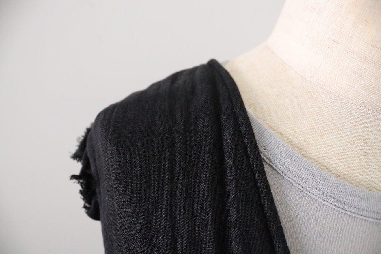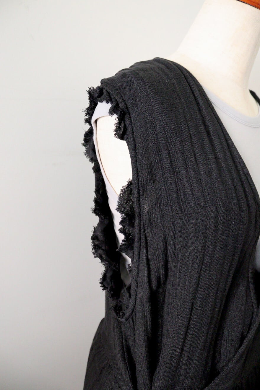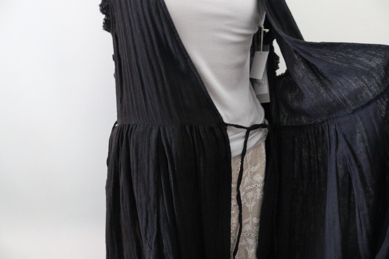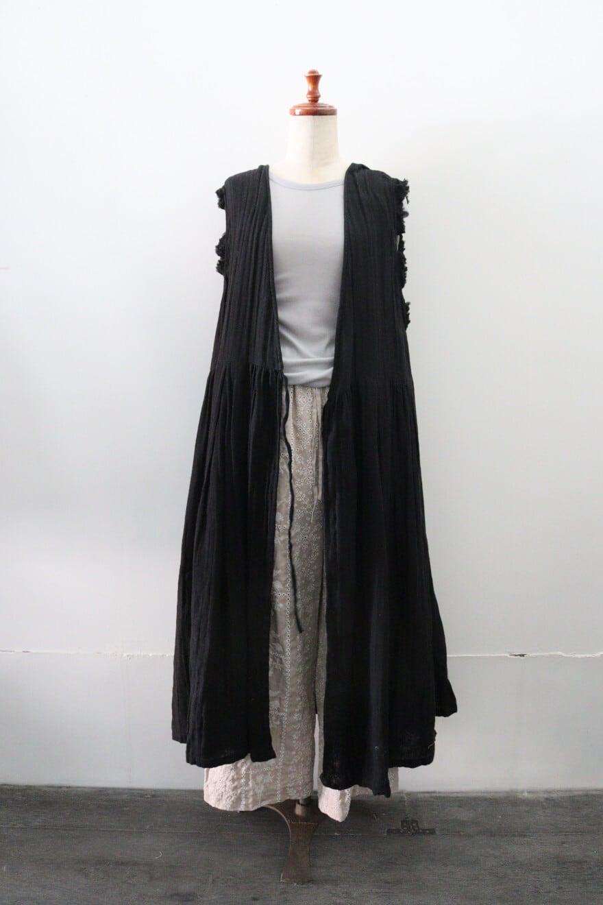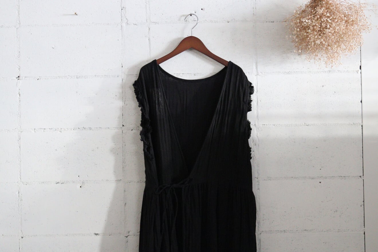 gauze# DOUBLE GAUZE CACHE COEUL DRESS 素材:コットン50%リネン50% サイズ:F 着丈115 身幅50cm カラー: ブラック ナチュラルモダンなダブルガーゼファブリックをあてがったGauze#らしい一枚。 ふわふわとやわらかな肌さわりが気持ちよく、洗いを重ねるほどに風合いが深まります。 アームの開きも広いのでボリューム袖ももたつかずどんなトップスにも合わせやすく、様々なレイヤードで着こなせそうです。 前を開けてロングジレとしての着こなしも◎