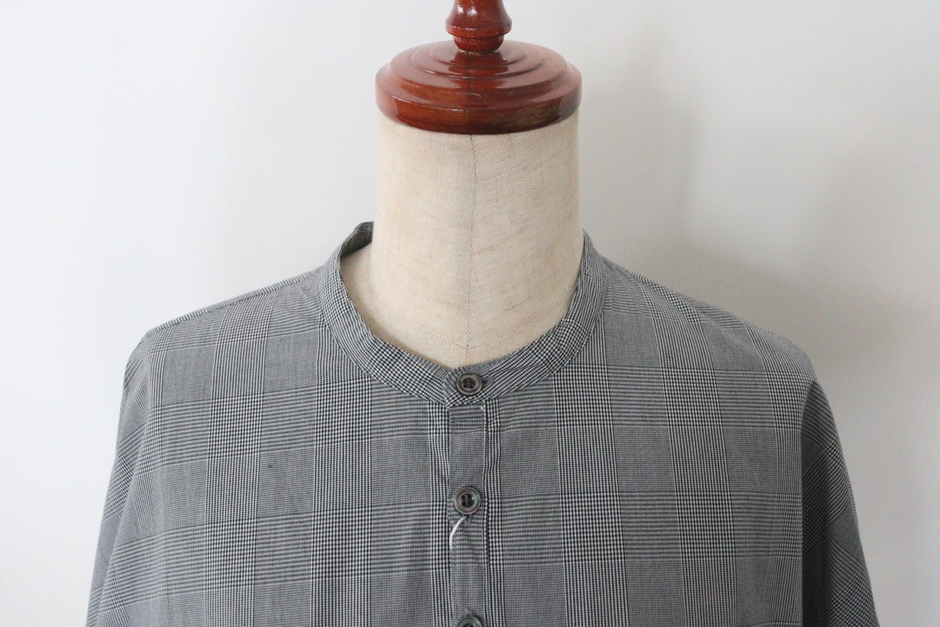 襟元はすっきりとした印象のバンドカラー。 フロントの3つボタンがアクセントに。