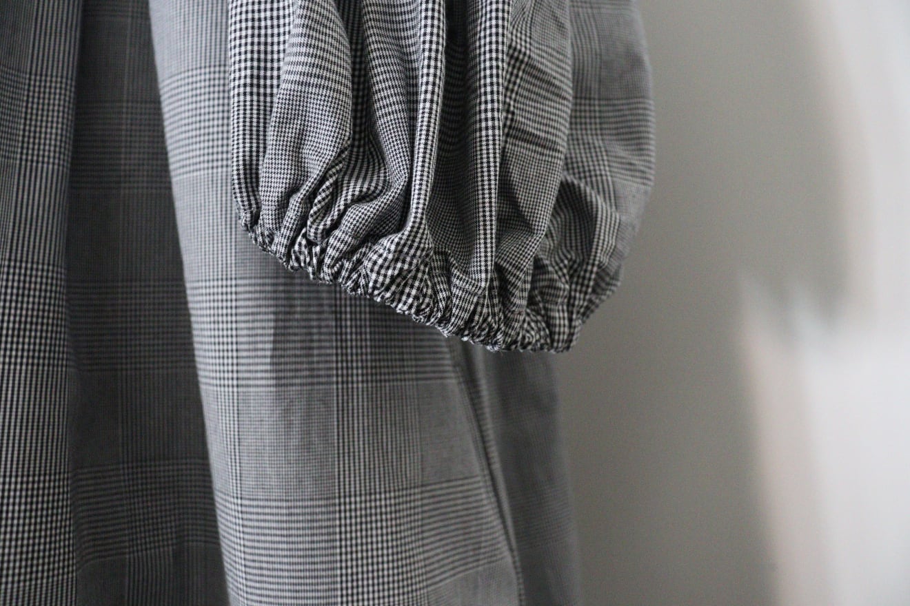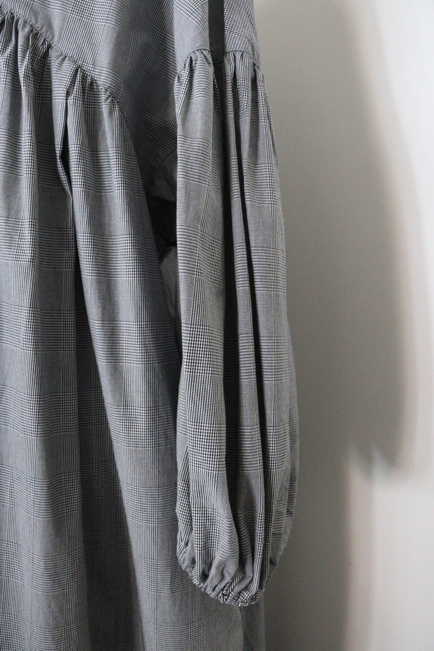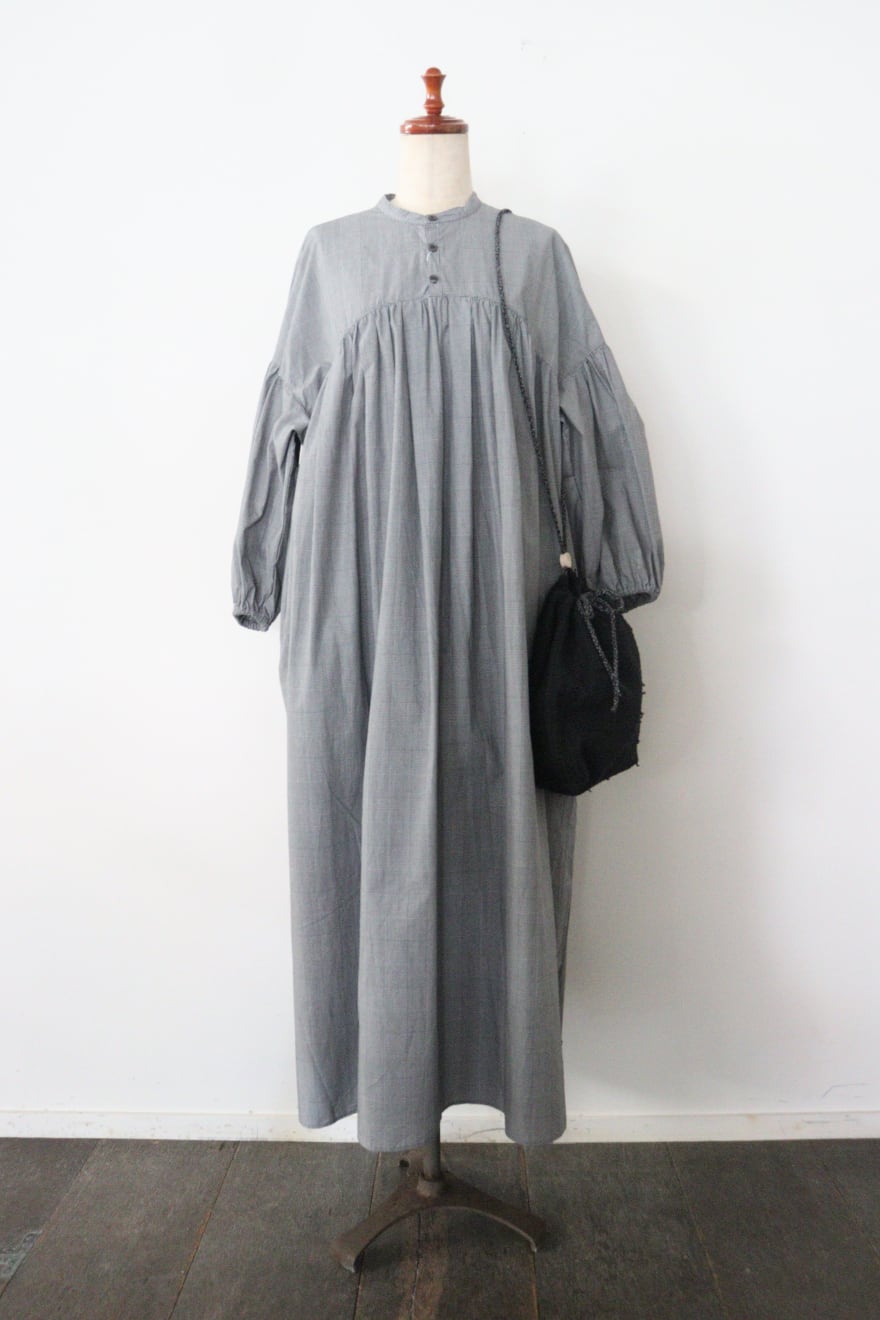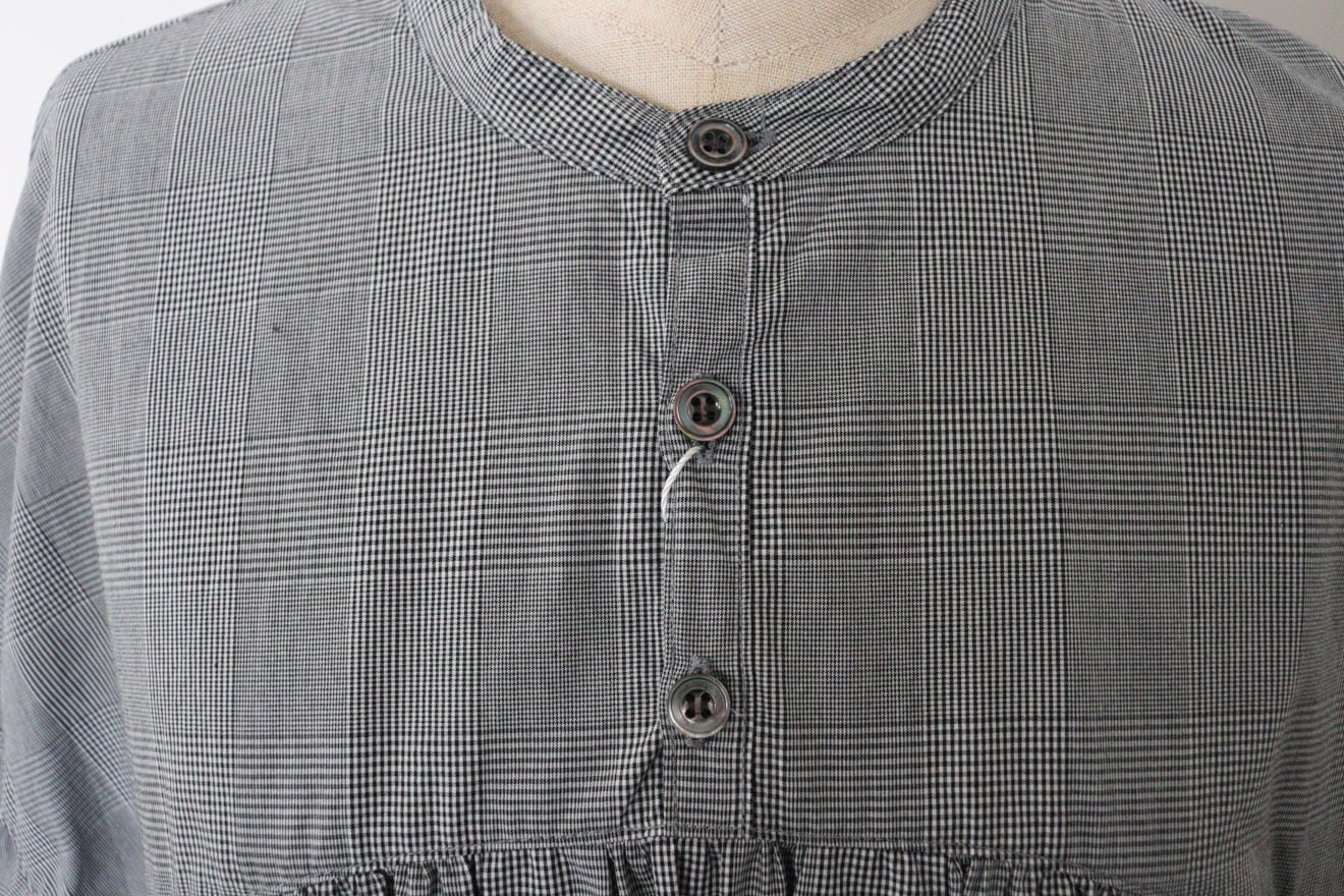 universal tissu グレンチェックバンドカラーギャザーワンピース